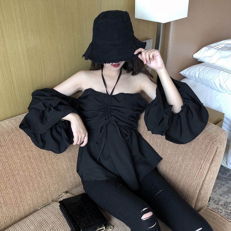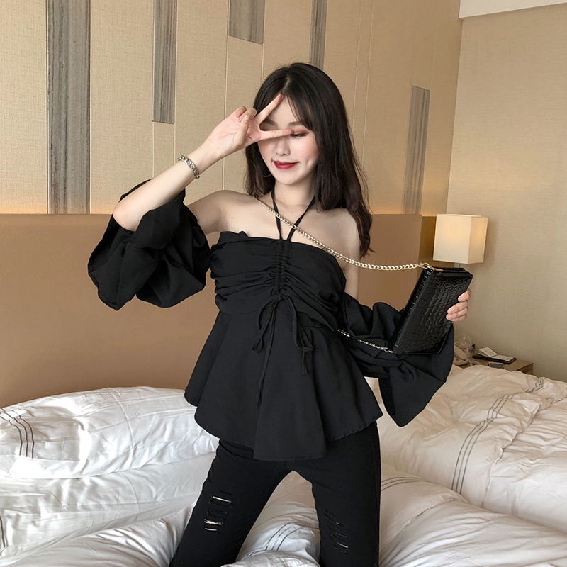 / 2018新款韓版小心機百搭復古chic氣質時尚女一字肩燈籠袖雪紡上衣