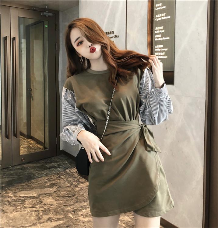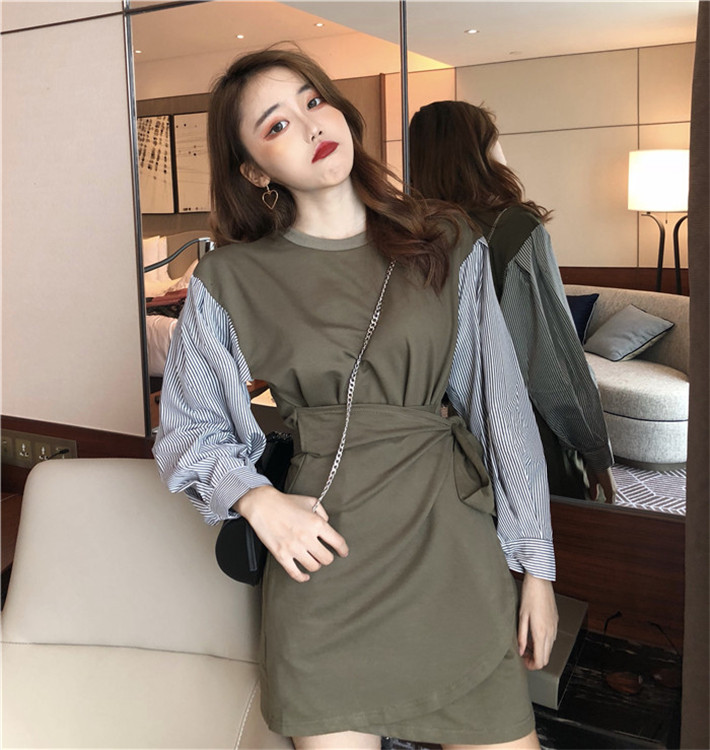 / 晚晚風新款時尚韓版chic圓領衛衣拼接條紋長袖不規則收腰連衣裙女