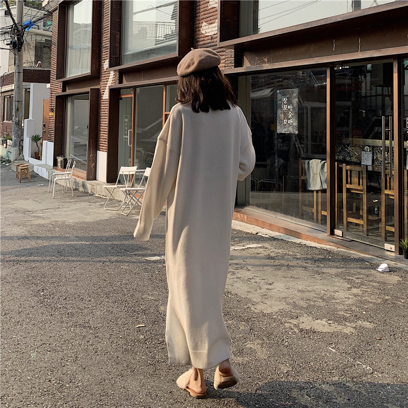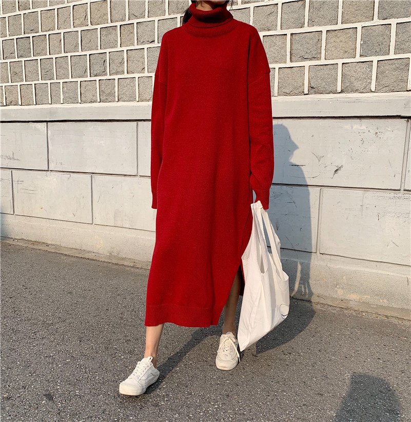 / 2018秋冬新款高領百搭長款純色修身開叉毛衣裙時尚復古chic連衣裙