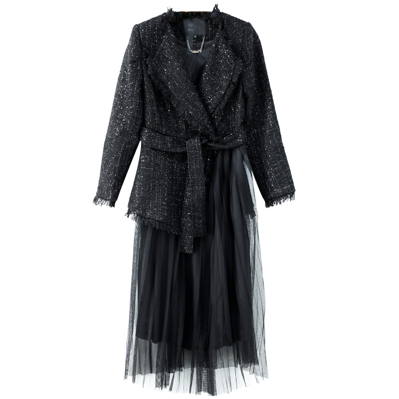 2018秋裝新款時尚休閑個性時髦毛呢西裝外套拼接網紗顯瘦連衣裙潮