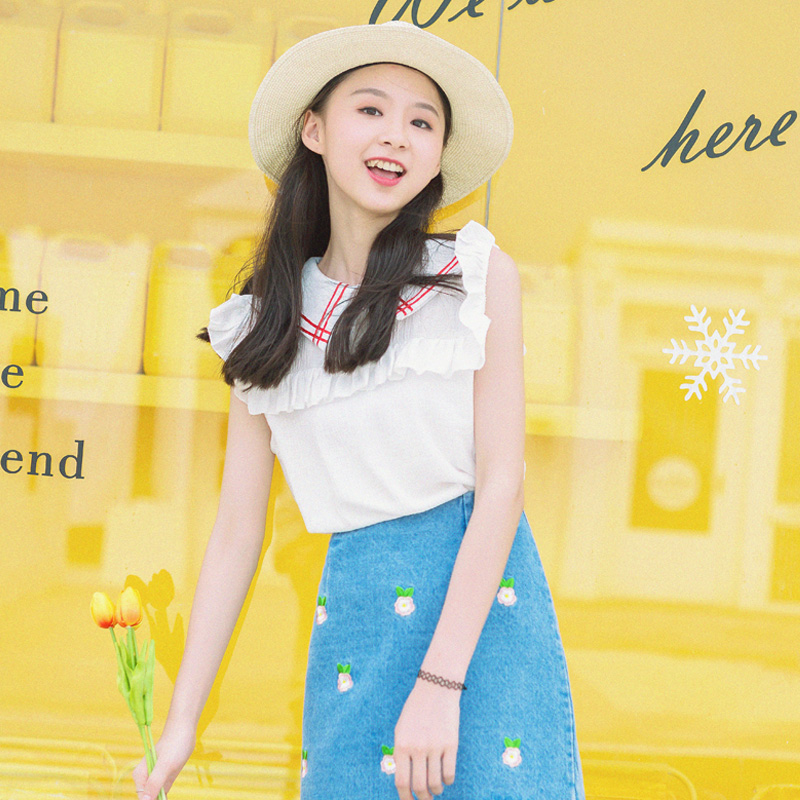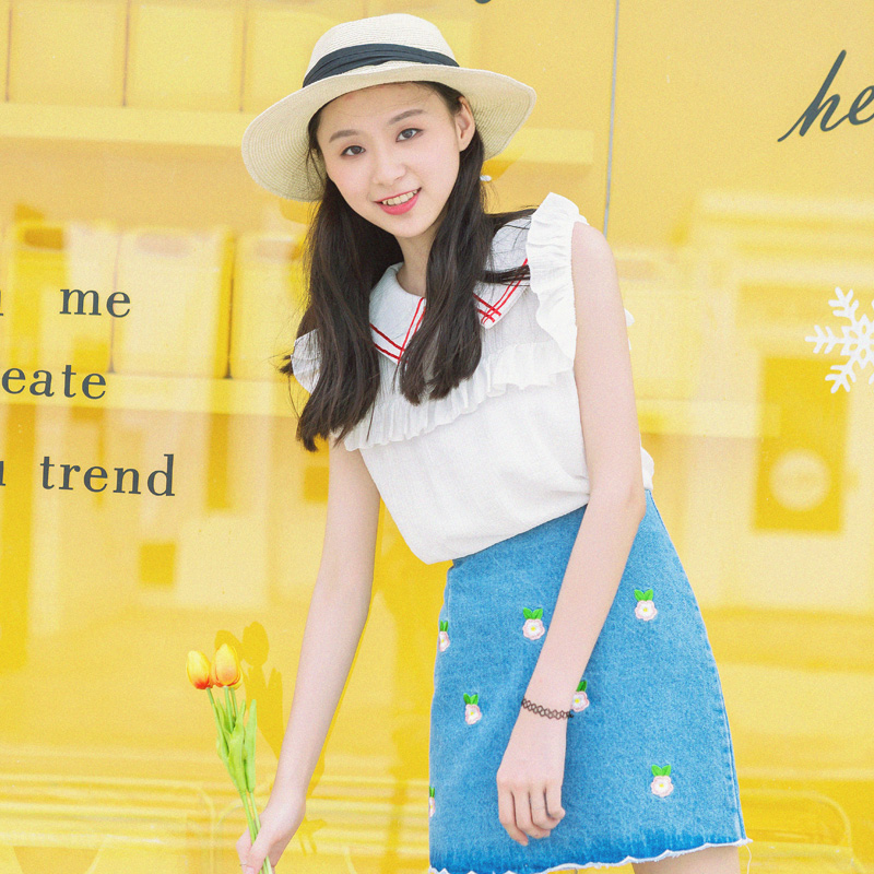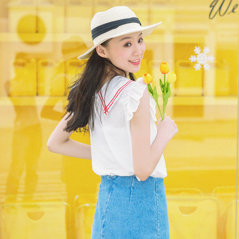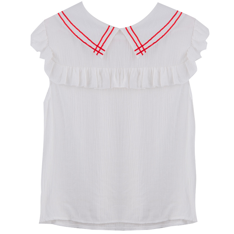 / 夏季新款韓版甜美拼色娃娃領荷葉邊無袖襯衫女寬松百搭上衣襯衣潮