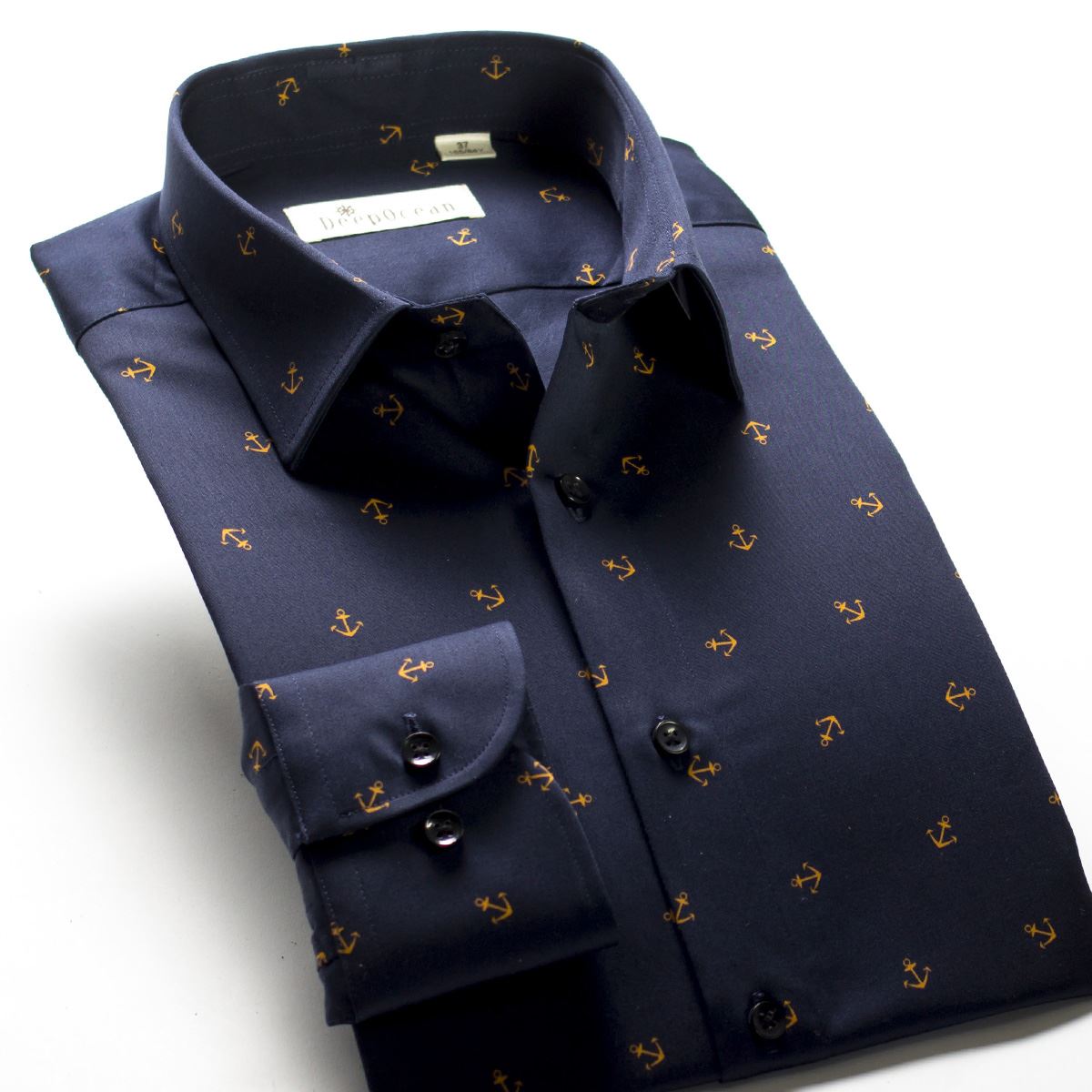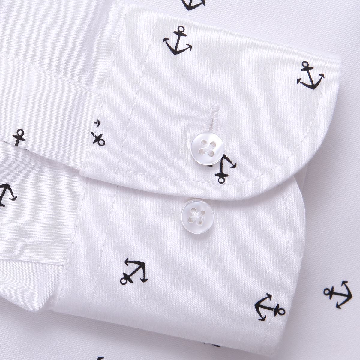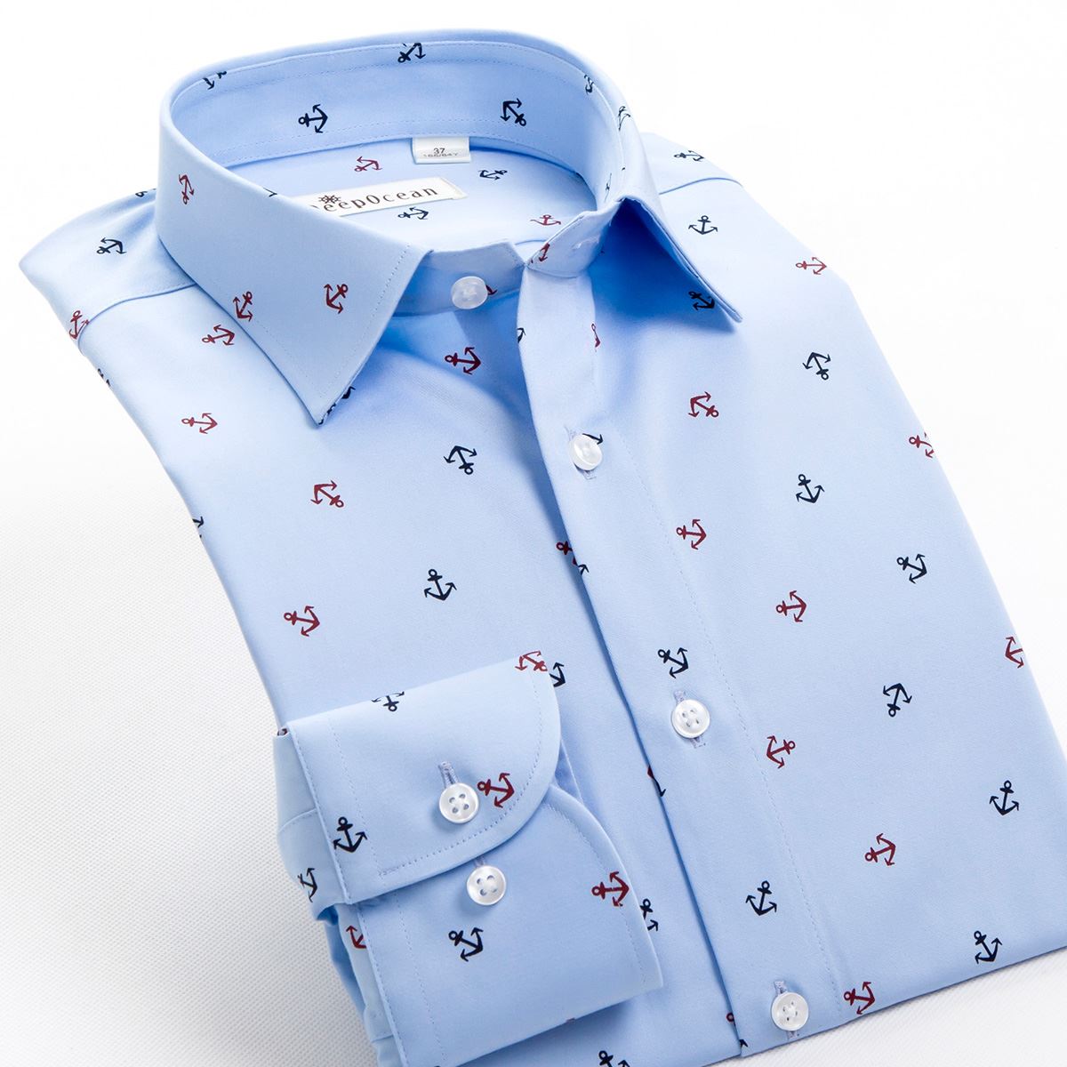 / 白色海錨印花長袖襯衫男式絲光棉時尚休閑純棉修身男裝韓版藍襯衣