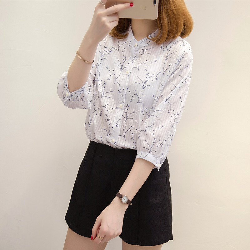 夏裝新款女裝寬松碎花白襯衣女夏季小清新上衣韓版雪紡襯衫女