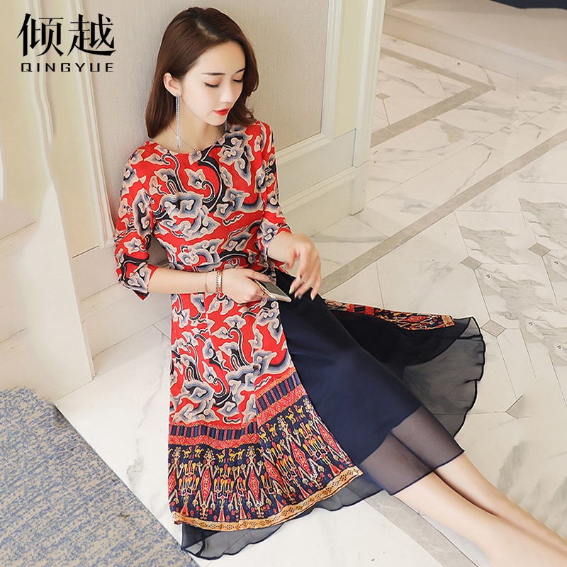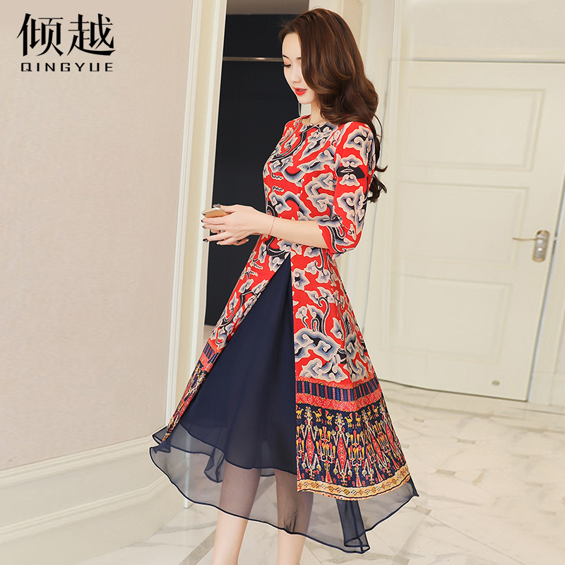 傾越2017夏季新款女裝連衣裙中長款修身民族風印花旗袍裙子套裝裙
