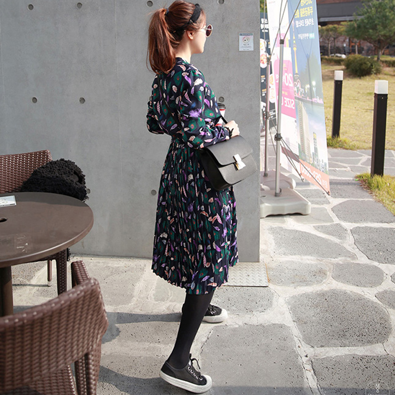 / 春秋韓版新款女裝襯衫打底連衣裙褶皺開衫裙碎花長袖雪紡裙