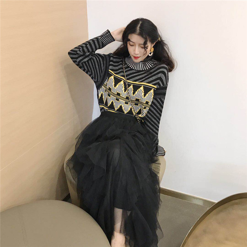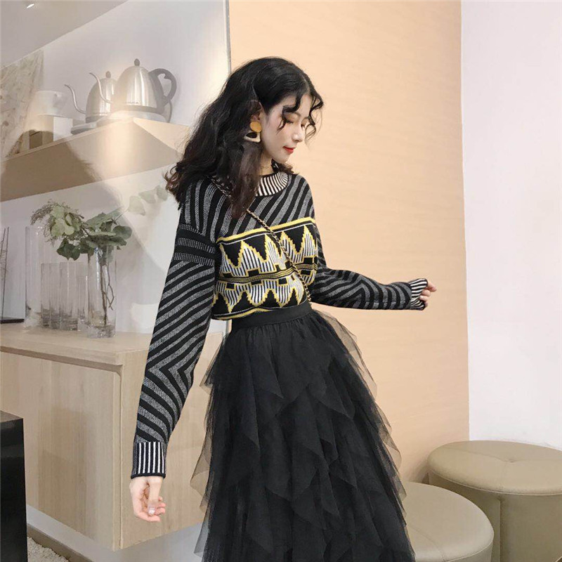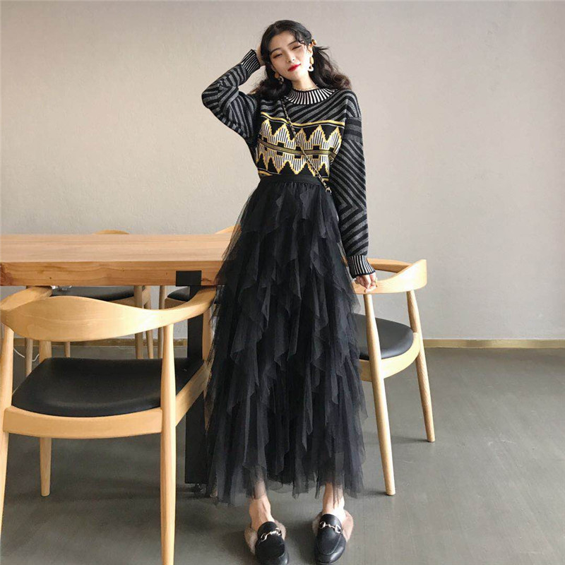 秋冬新款寬松幾何圖案印花毛衣時尚套裝高腰百搭網紗半身裙兩件套