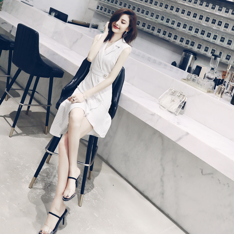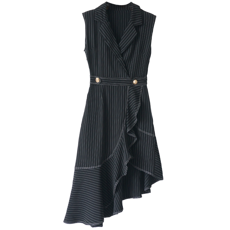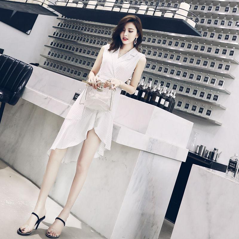 S秀2018夏季新款v領時尚條紋不規則裙中長款修身顯瘦波浪連衣裙