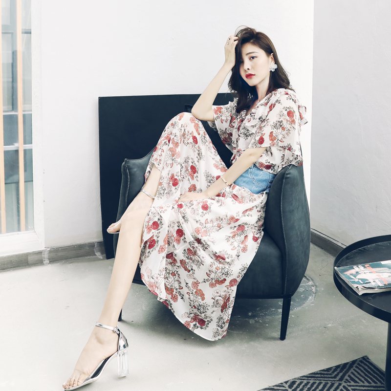 / S秀淑女氣質2018夏季新款露肩印花雪紡連衣裙牛仔腰封兩件套潮