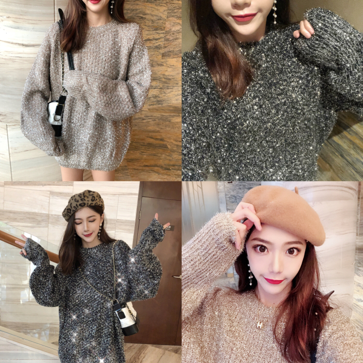 新款復古閃閃毛衣針織衫寬松慵懶風圓領長袖百搭chic風顯瘦上衣女