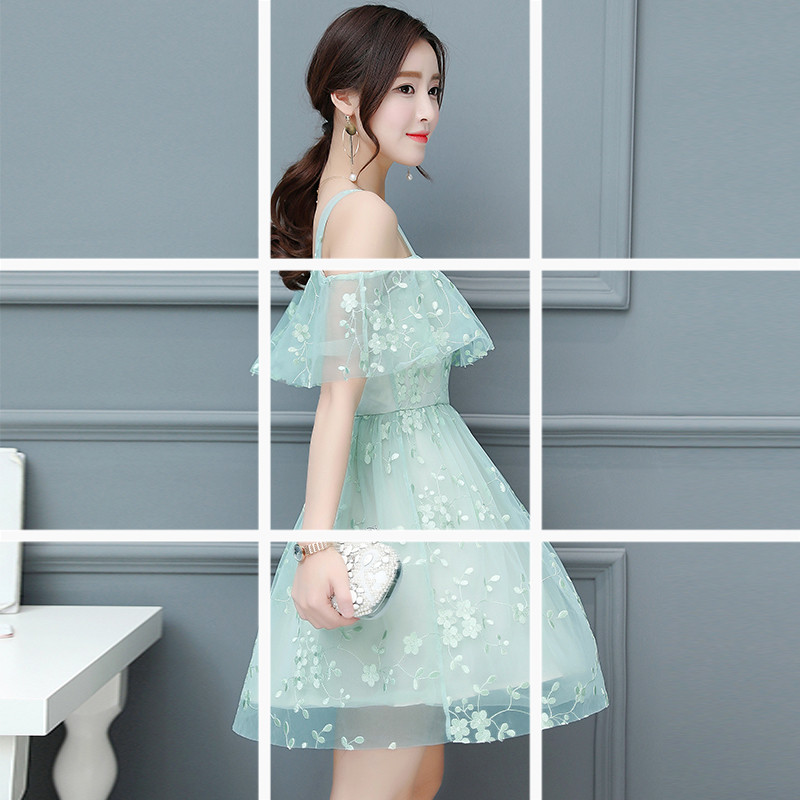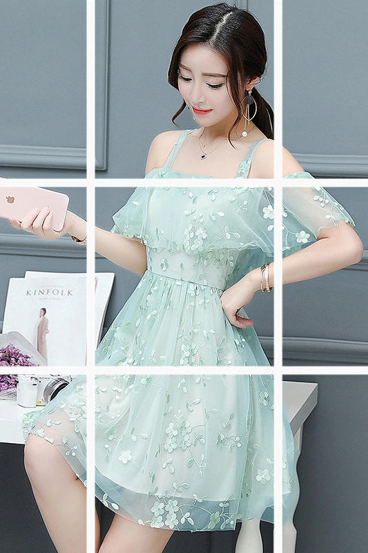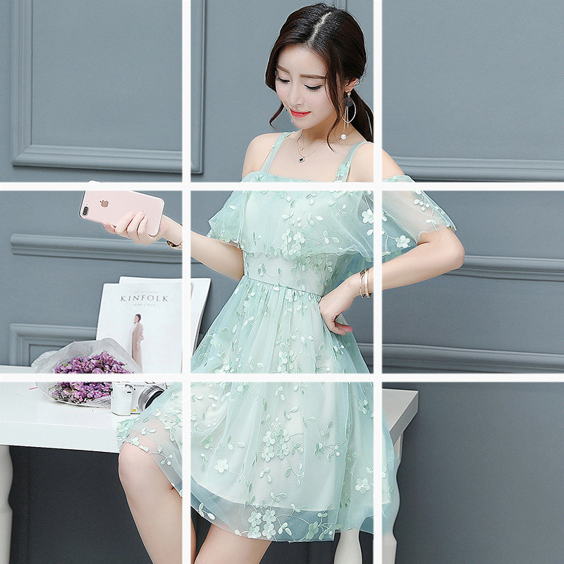 / 性感露肩吊帶裙款夏季小清新仙女蕾絲碎花雪紡連衣裙女中長款