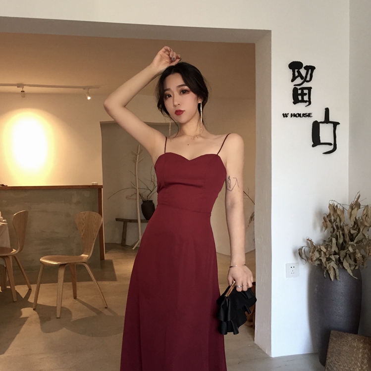 / 新款chic性感露背交叉綁帶修身顯瘦中長款純色時尚吊帶連衣裙女潮