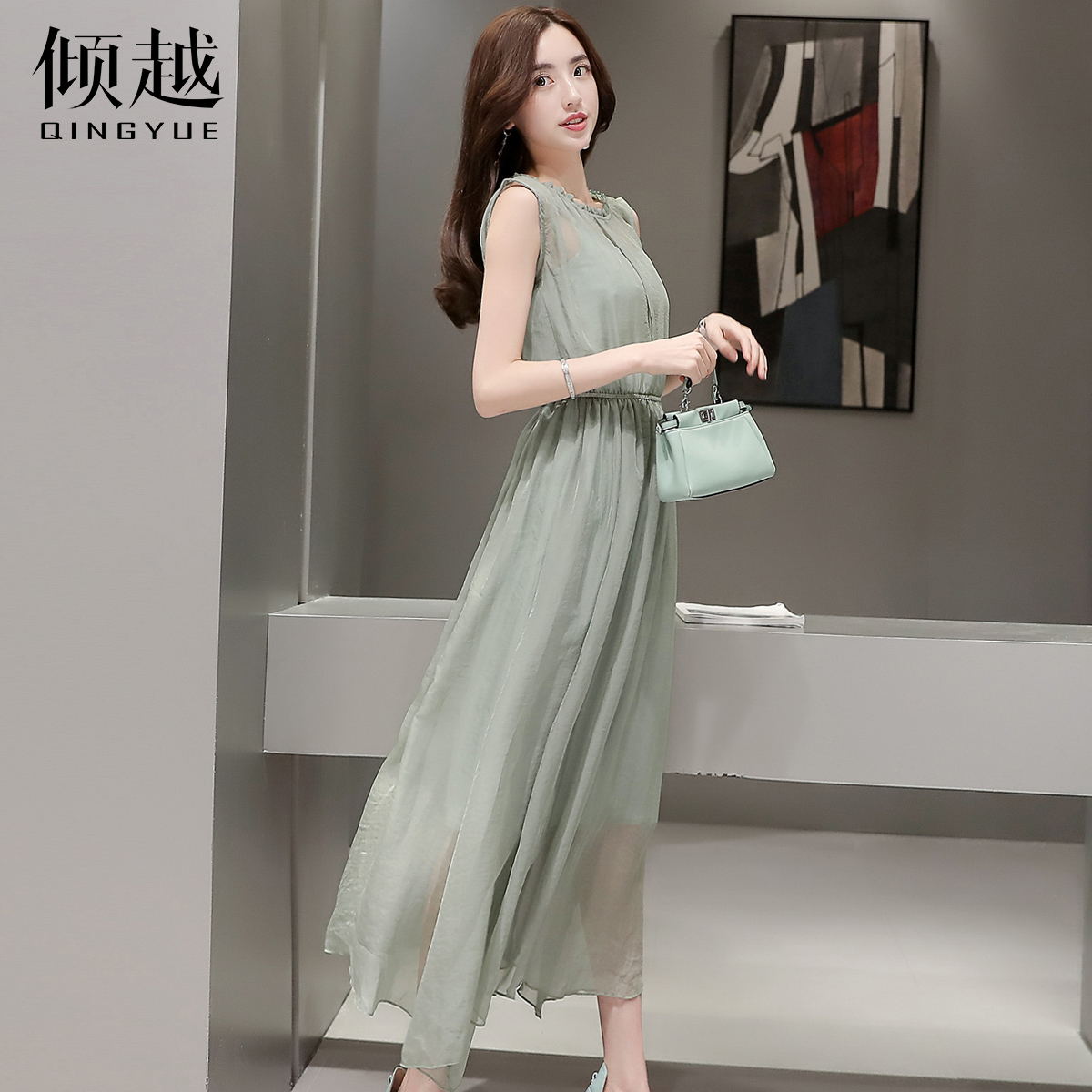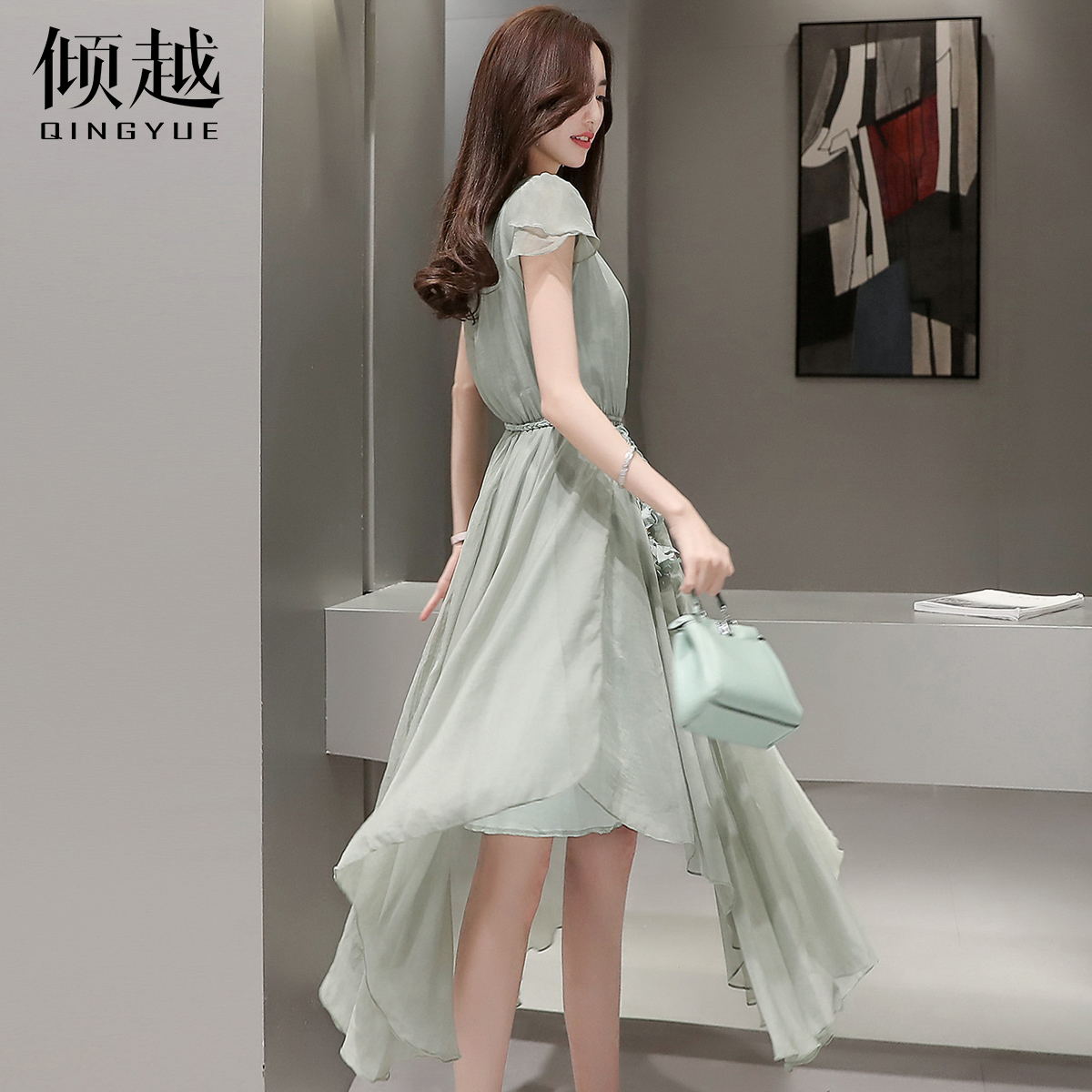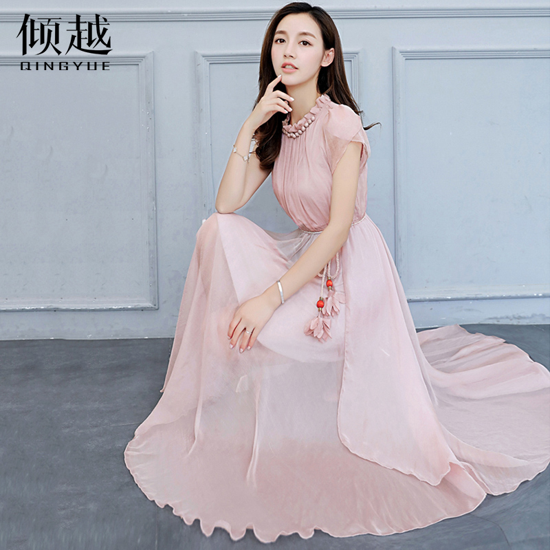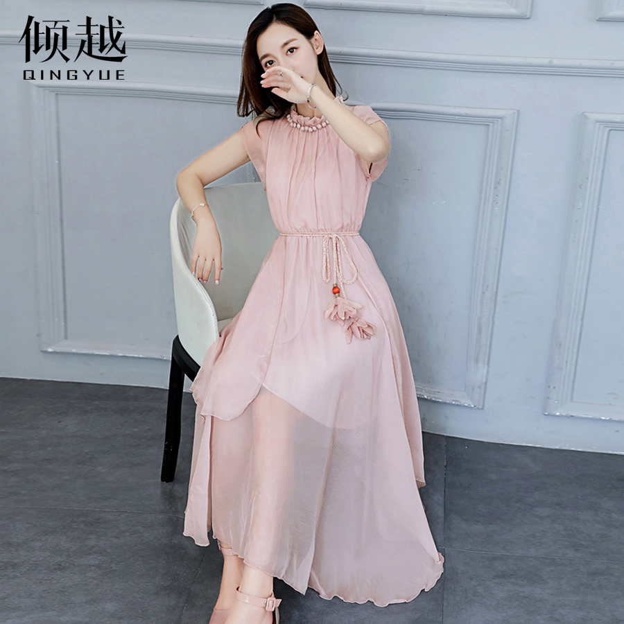 / 2017夏韓版花邊立領花瓣袖連衣裙不規則雪紡大擺裙收腰A字中長裙