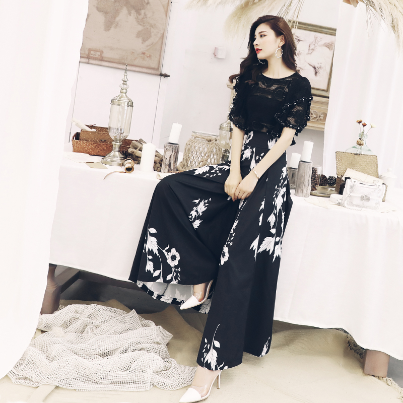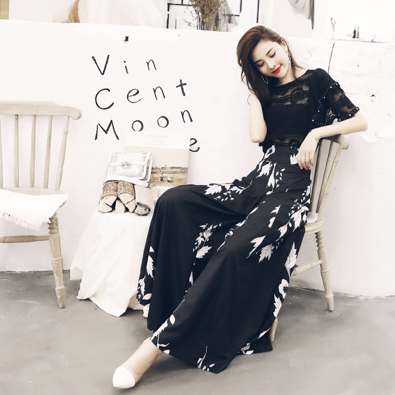 / 名媛氣質印花褲子2018新款鏤空上衣垂感高腰長褲闊腿褲夏兩件套裝
