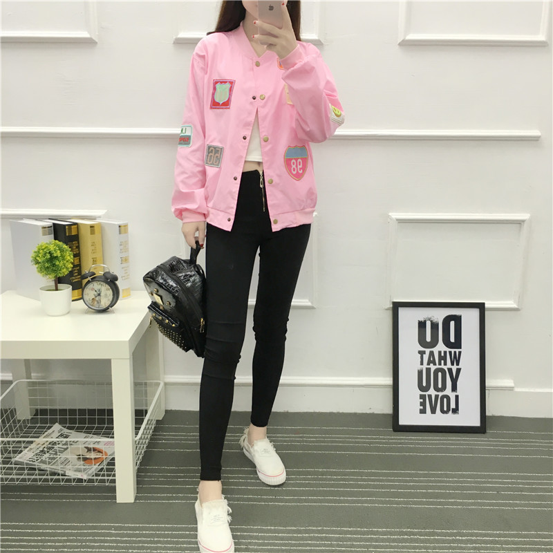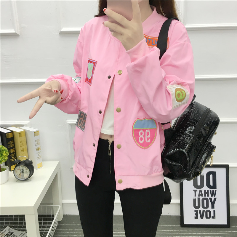 原宿風bf外套女春秋學生夾克棒球服2017新款長袖寬松粉色貼布補潮