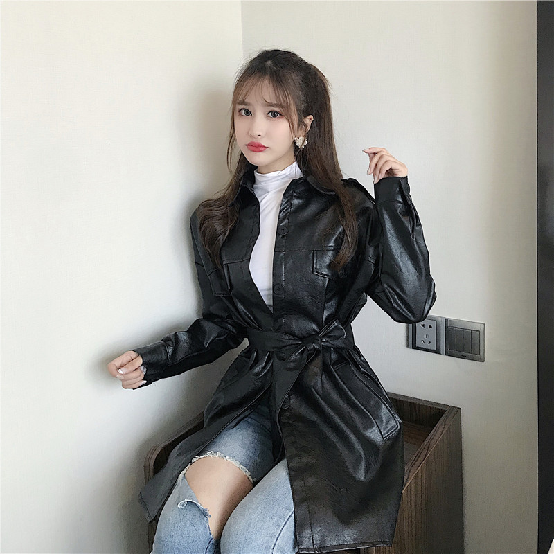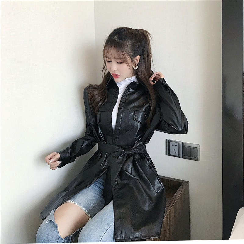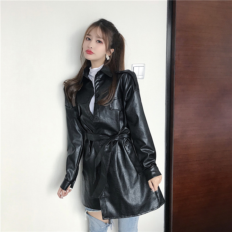 / 韓風復古小香風新款秋季時尚百搭氣質收腰系帶pu皮質風衣連衣裙潮