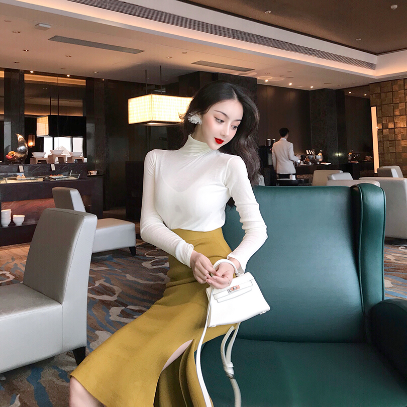 新款韓版百搭早秋慵懶t恤女長袖打底衫半高領修身顯瘦chic上衣潮