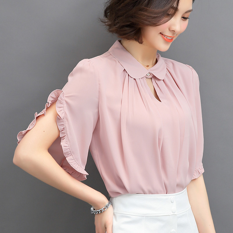 / 春裝2017新款女夏季女裝大碼雪紡衫短袖上衣女夏寬松喇叭袖娃娃領