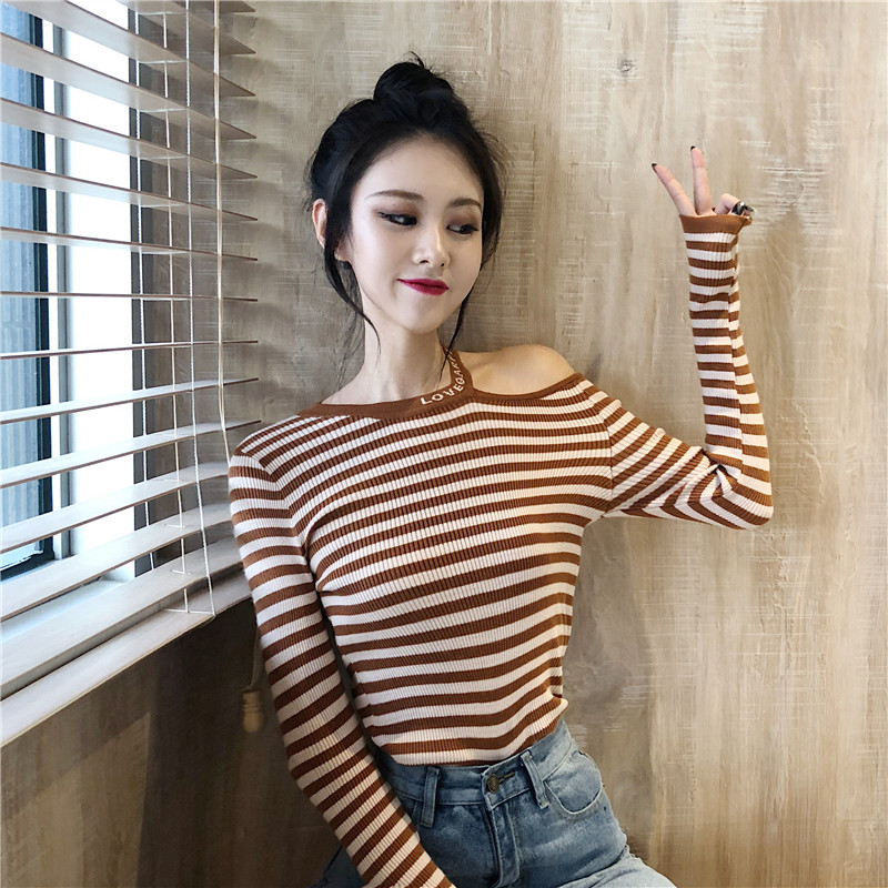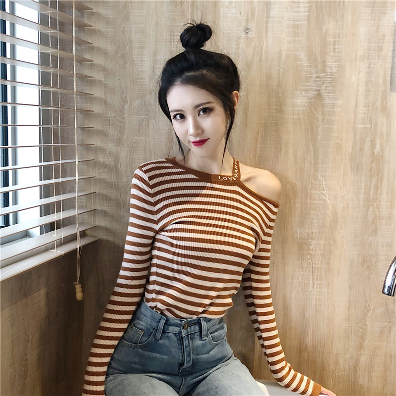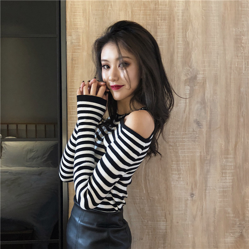 / 條紋針織衫女長袖2018秋裝新款chic掛脖露肩修身小心機撞色打底衫