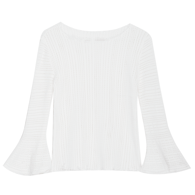 / 春裝新款女裝韓版顯瘦喇叭袖鏤空白色針織衫長袖打底衫上衣潮