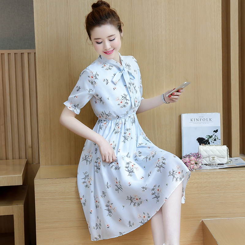 / 夏季新款小清新森女時尚短袖碎花雪紡打底修身中長款連衣裙女