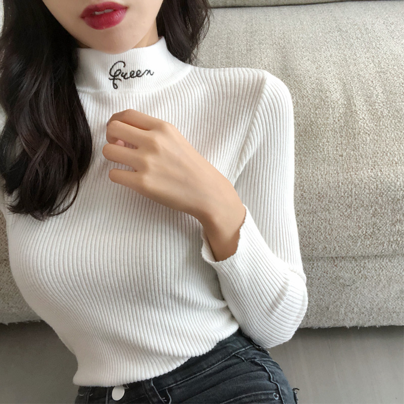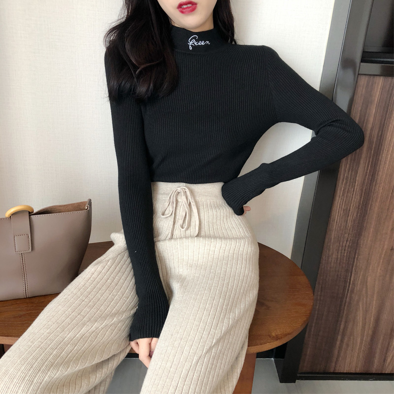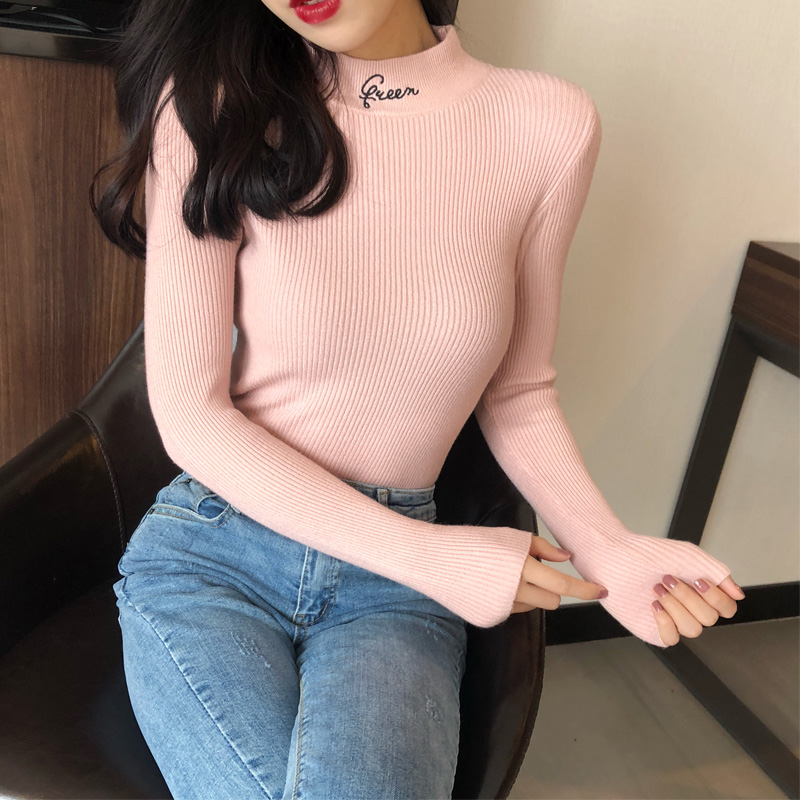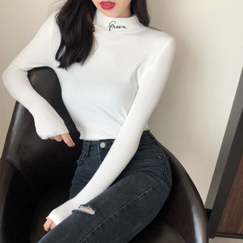 / 秋冬新款半高領刺繡字母套頭上衣chic修身顯瘦針織衫女長袖打底衫
