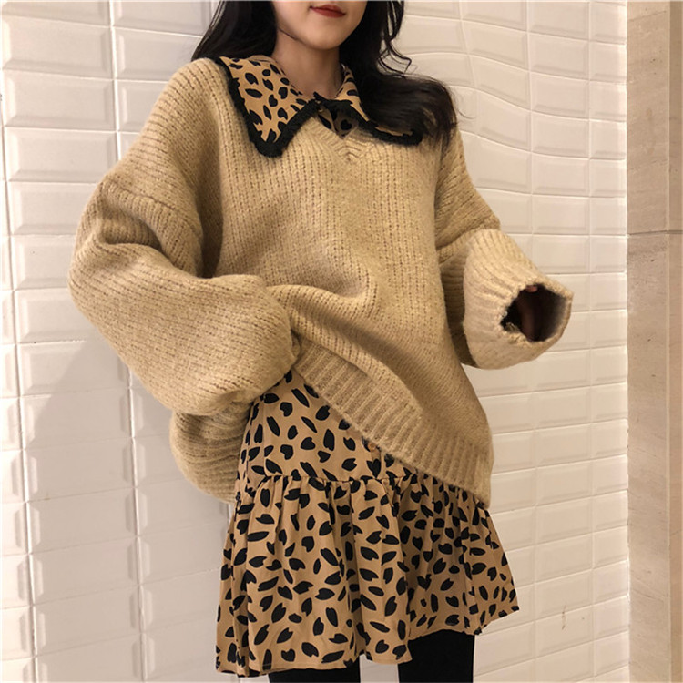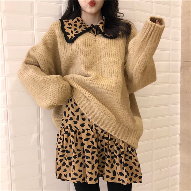 新款韓版復古流蘇娃娃領豹紋收腰連衣裙圓領套頭毛衣女時尚套裝潮