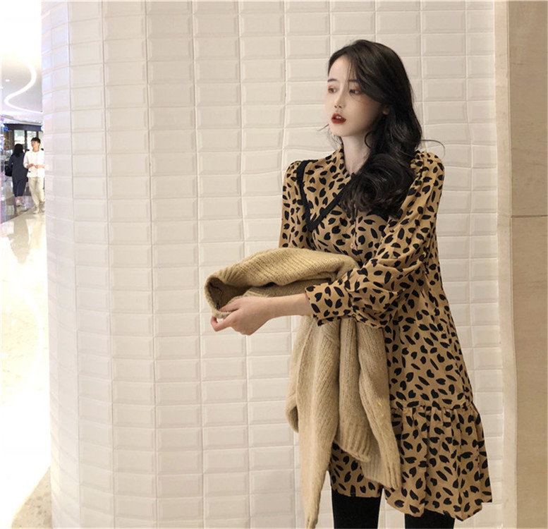 / 新款韓版復古流蘇娃娃領豹紋收腰連衣裙圓領套頭毛衣女時尚套裝潮