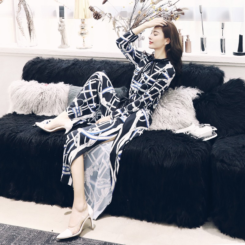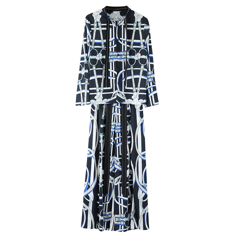 名媛2018秋季新款女裝韓版時髦氣質印花時尚套裝開叉闊腿褲兩件套