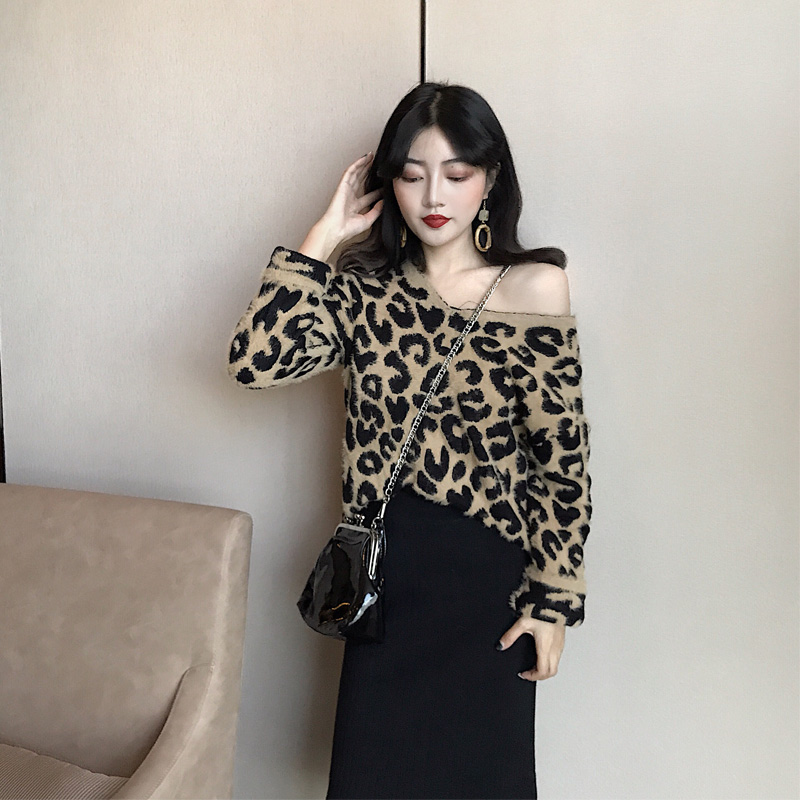 / 港味慵懶風毛衣女V領寬松豹紋長袖針織半身裙兩件套時尚氣質套裝
