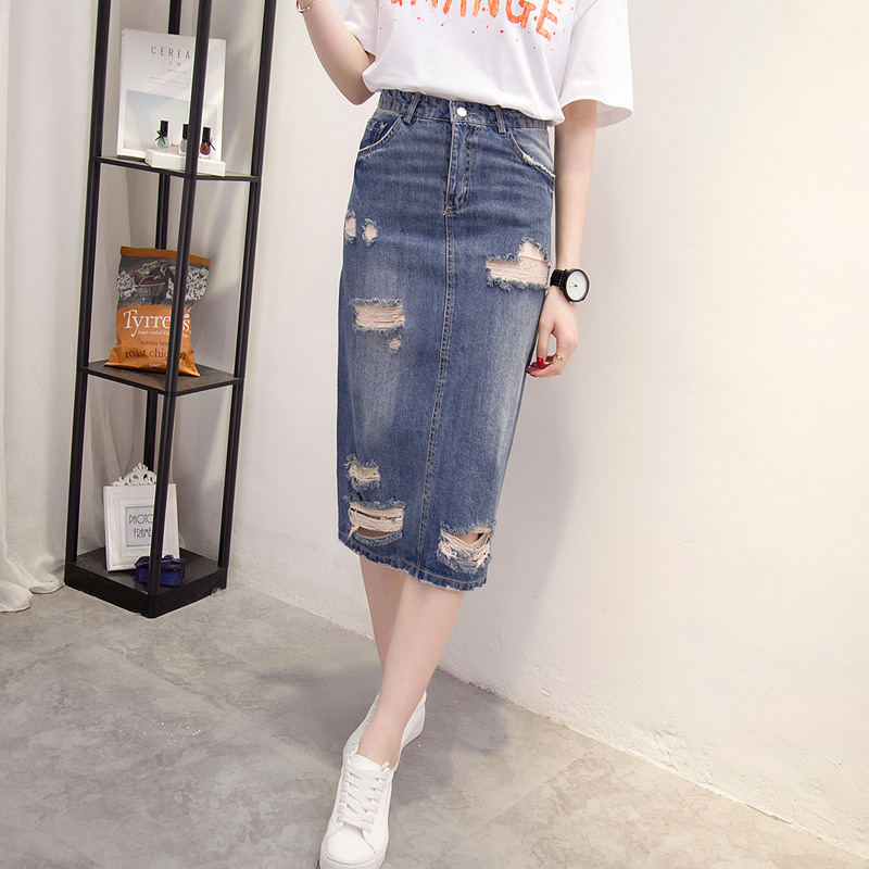 / 女裝夏裝新款潮破洞牛仔裙子女春中長款直筒寬松韓版低腰百搭