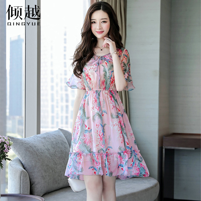 2017碎花雪紡連衣裙女夏裝新款氣質韓國v領喇叭袖荷葉邊裙子顯瘦