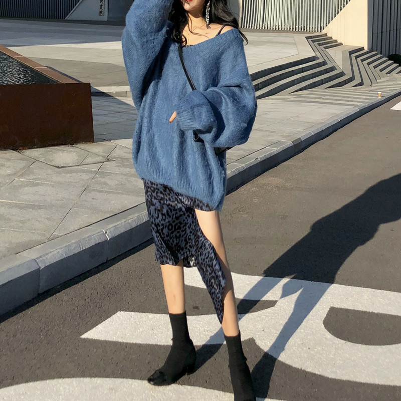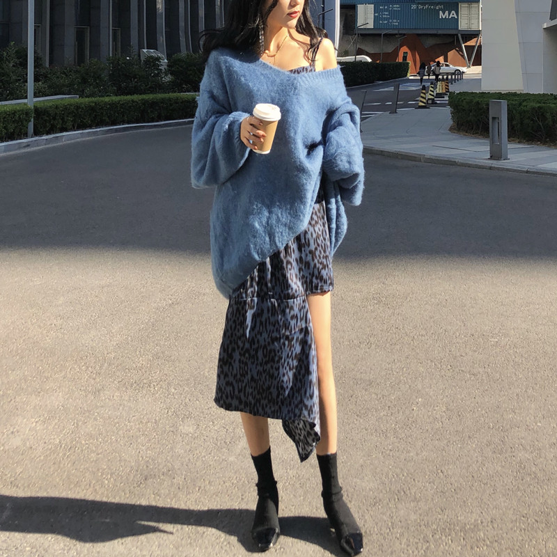 藍色毛衣|奶茶色毛衣|黑色吊帶裙|豹紋吊帶裙