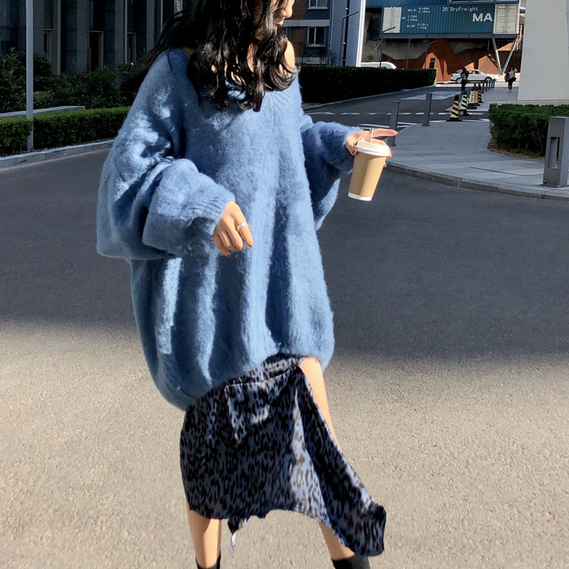 / chic寬松百搭燈籠袖V領慵懶針織衫毛衣豹紋吊帶連衣裙時尚套裝潮