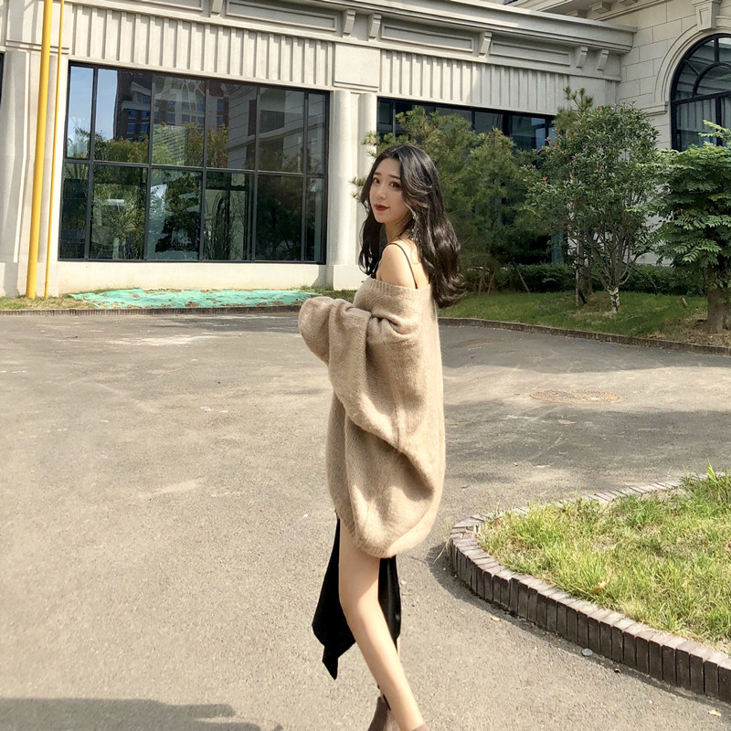 chic寬松百搭燈籠袖V領慵懶針織衫毛衣豹紋吊帶連衣裙時尚套裝潮