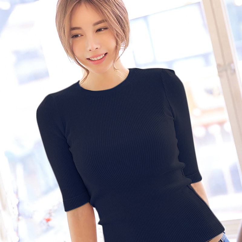 中袖圓領短款針織衫女 秋季套頭打底針織衫毛衣女顯瘦毛衣女外套