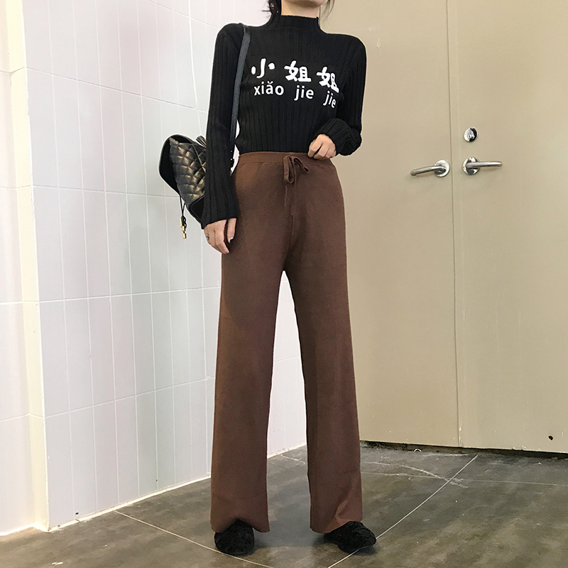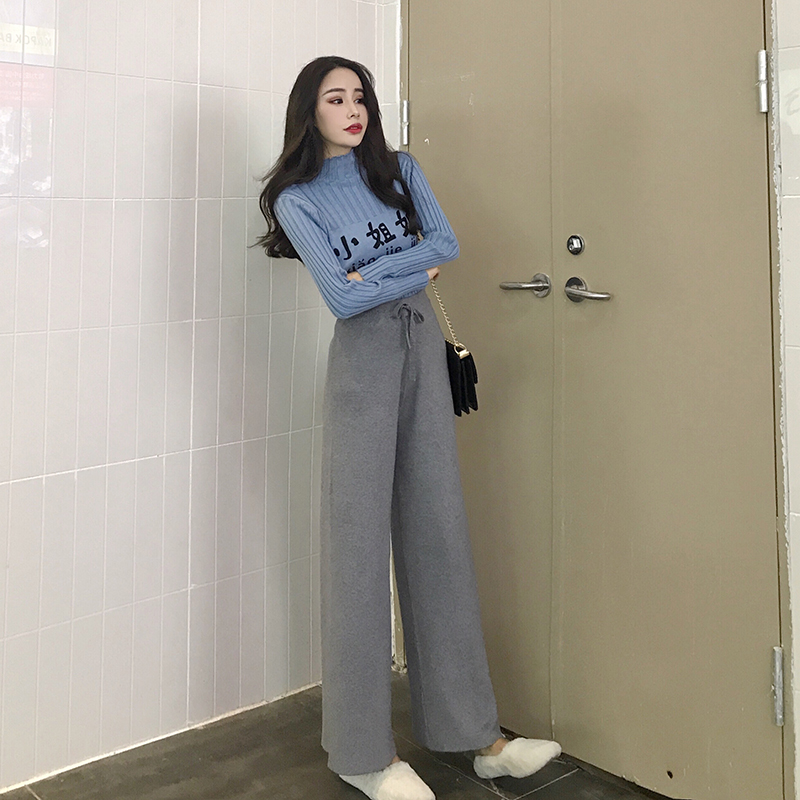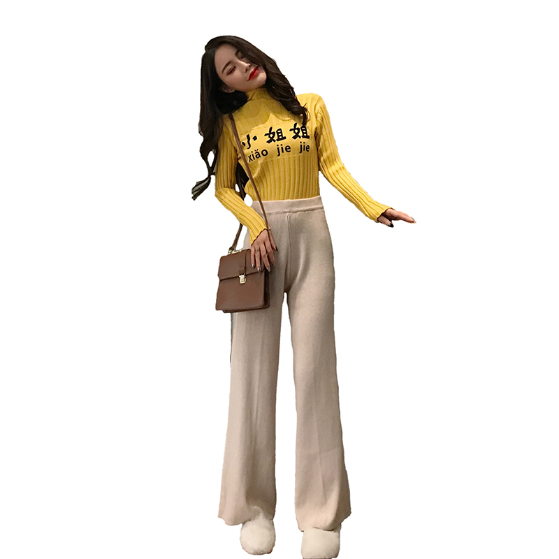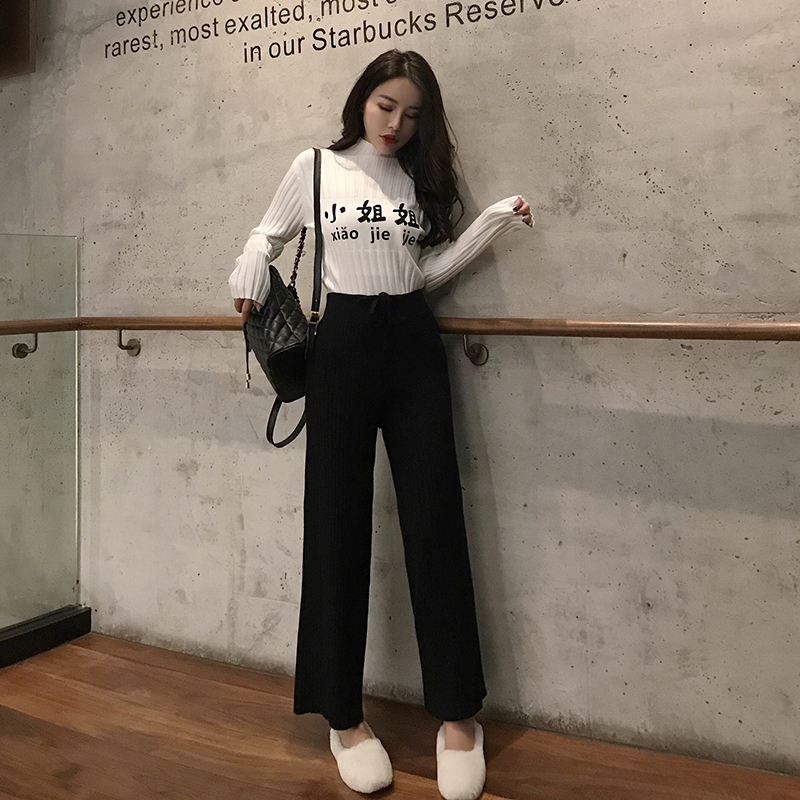 秋冬新款韓版港風時尚針織打底上衣針織高腰闊腿長褲氣質套裝女潮