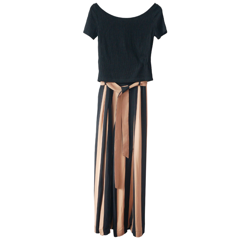 時尚闊腿褲套裝女夏2018新款短袖T恤條紋綁定高腰開叉長褲兩件套