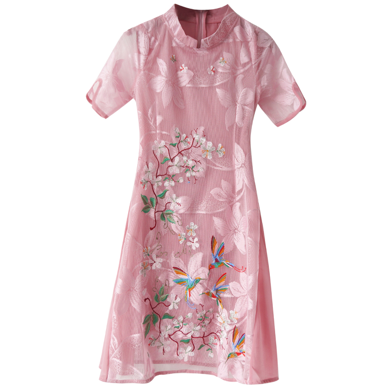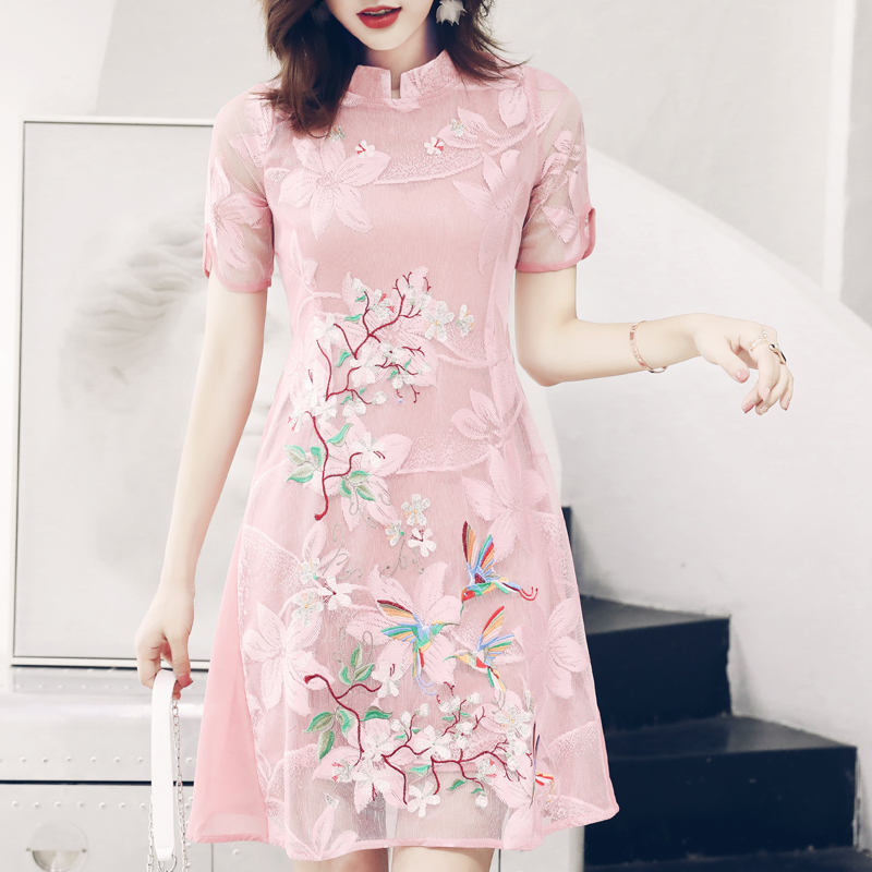 S秀2018夏新款復古刺繡蕾絲純色短袖連衣裙中國風改良旗袍