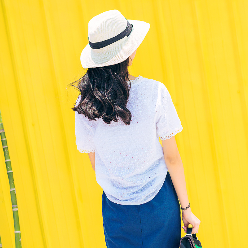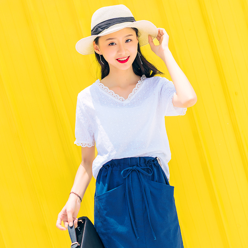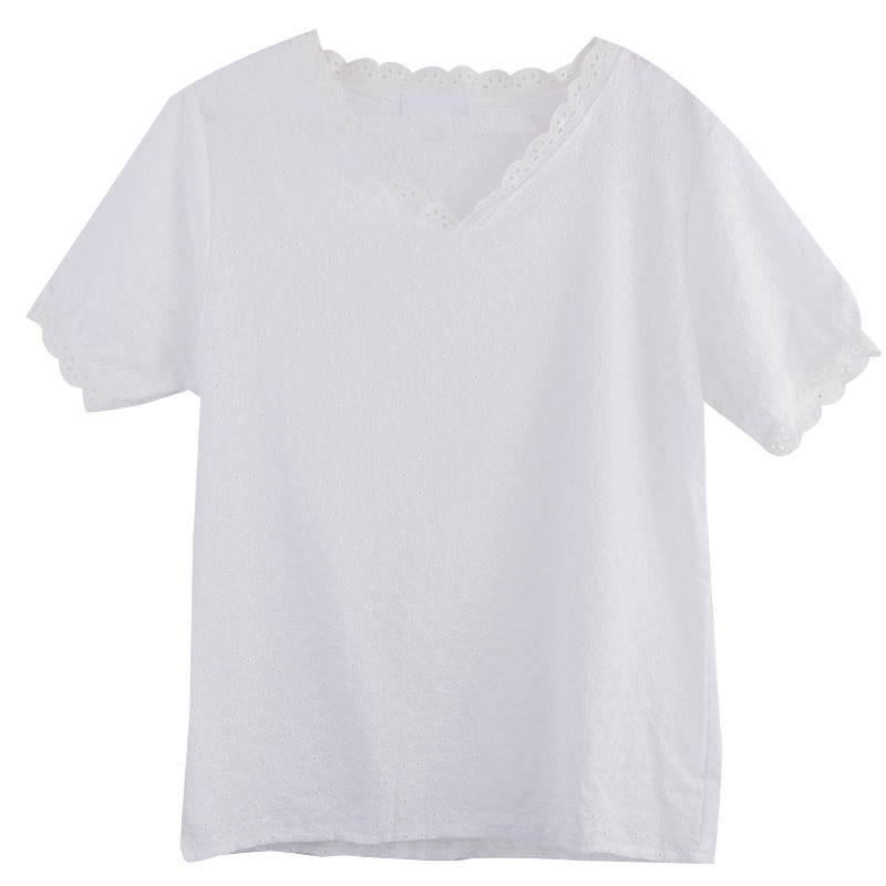 / 夏裝新款蕾絲拼接V領五分袖白色雪紡衫女寬松鏤空學生上衣潮