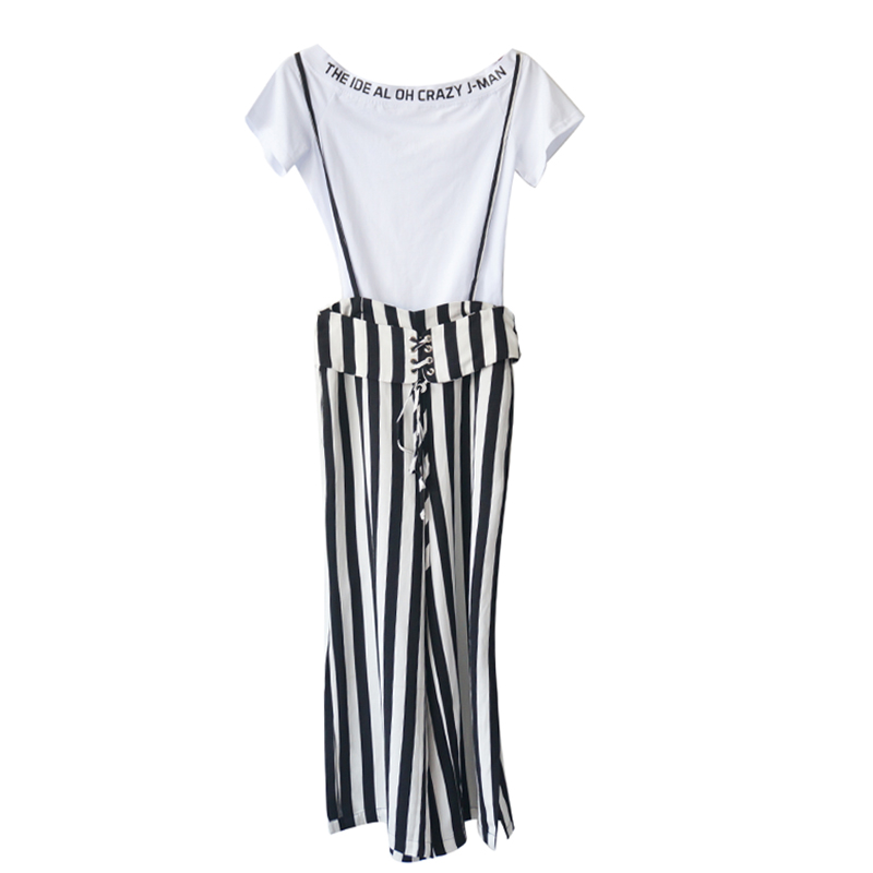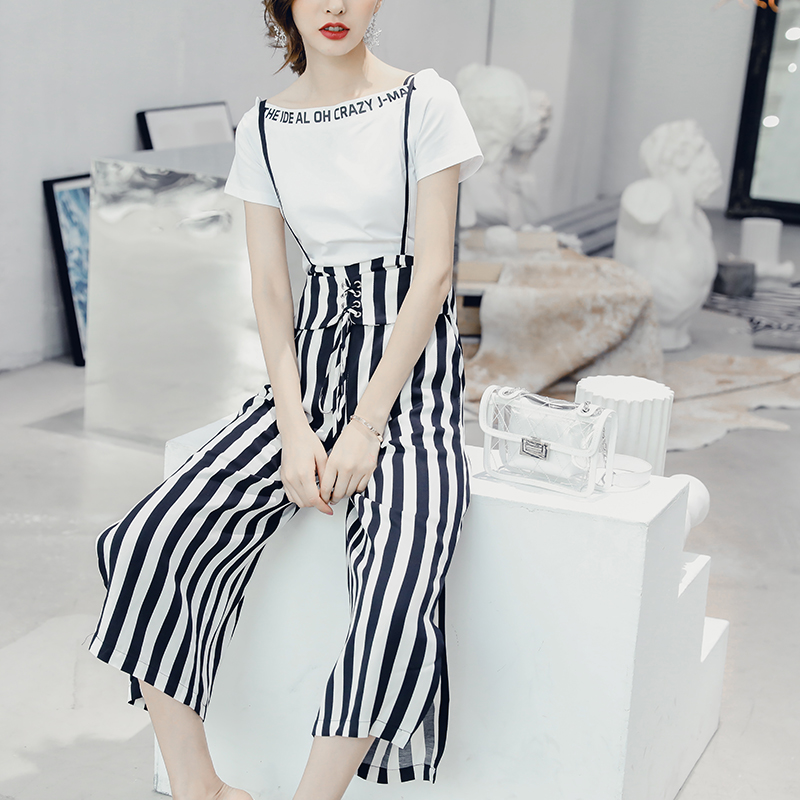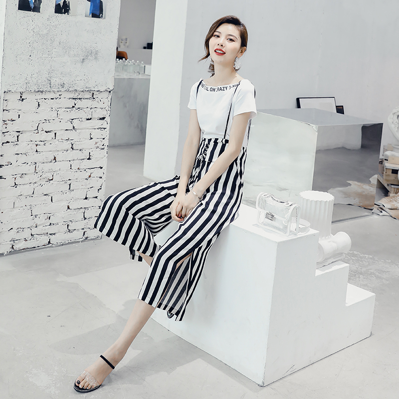 / 背帶連體闊腿褲女夏季新款韓版七分褲高腰白色T恤條紋垂感兩件套
