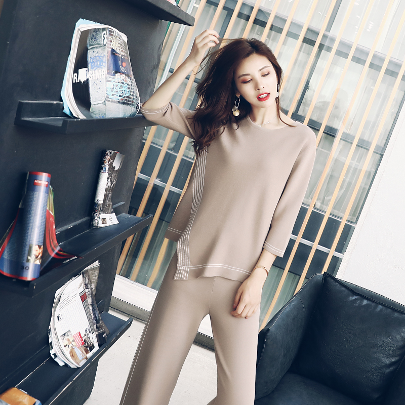 / S秀2018夏季新款女時尚氣質兩件套圓領個性上衣闊腿褲針織套裝