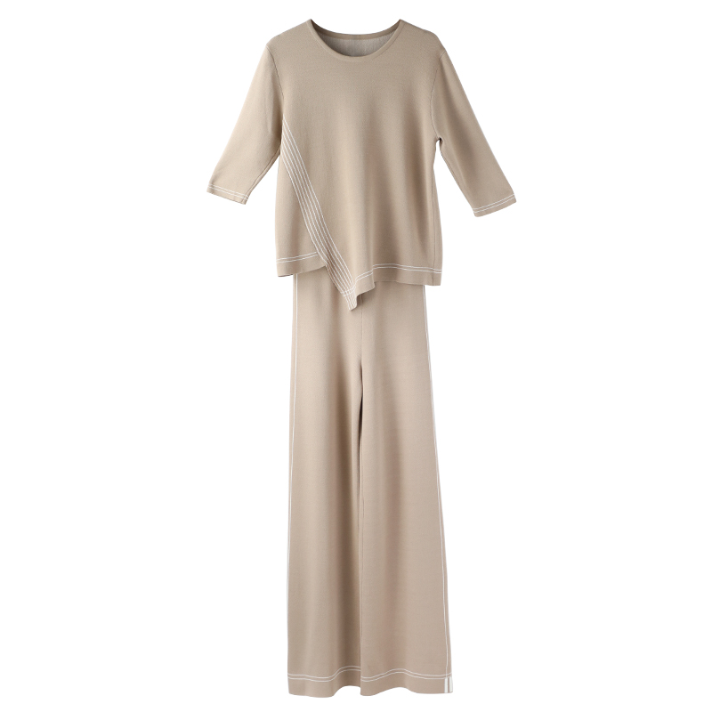 S秀2018夏季新款女時尚氣質兩件套圓領個性上衣闊腿褲針織套裝