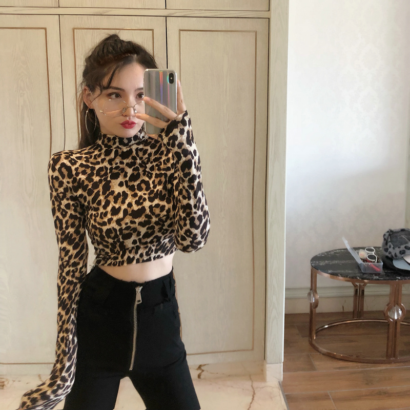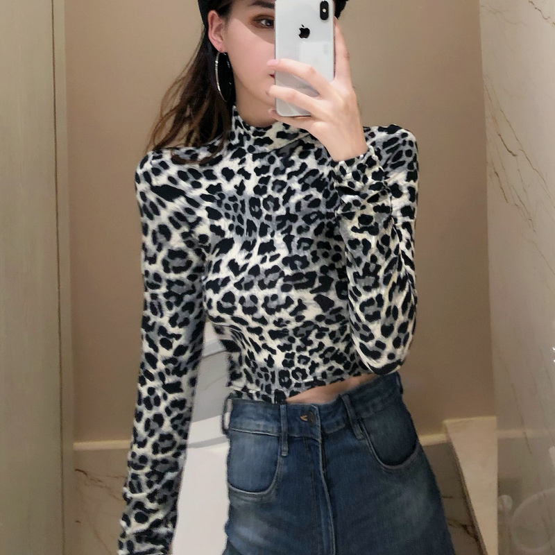 / 2018新款chic韓國港風小高領時尚豹紋短款長袖T恤修身潮流上衣女