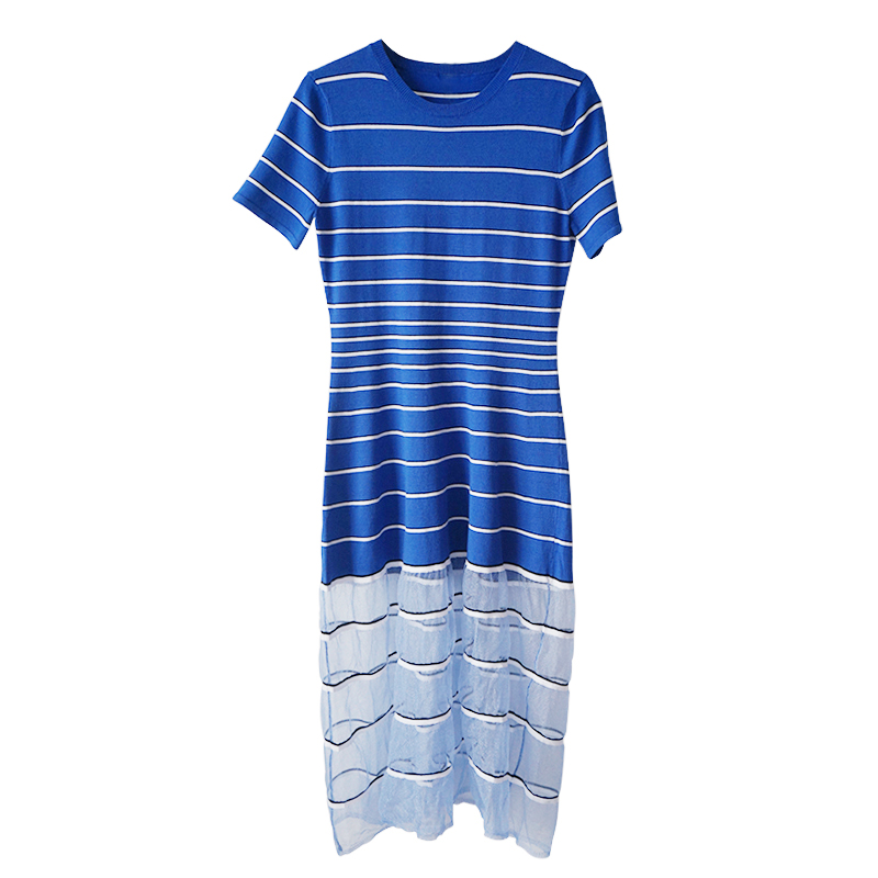 名媛慵懶風裙子夏女2018新款氣質極簡主義條紋拼接針織連衣裙