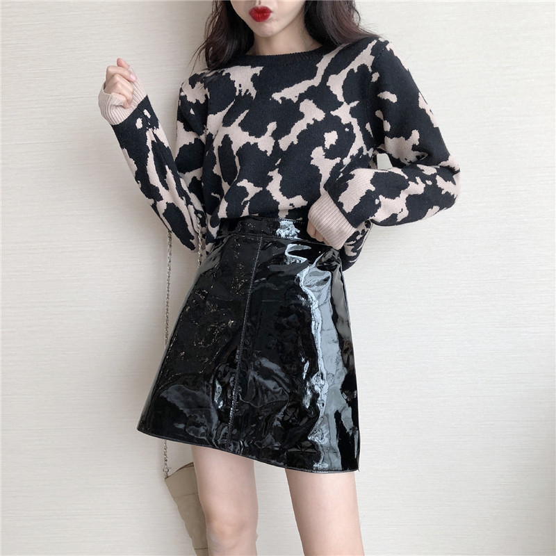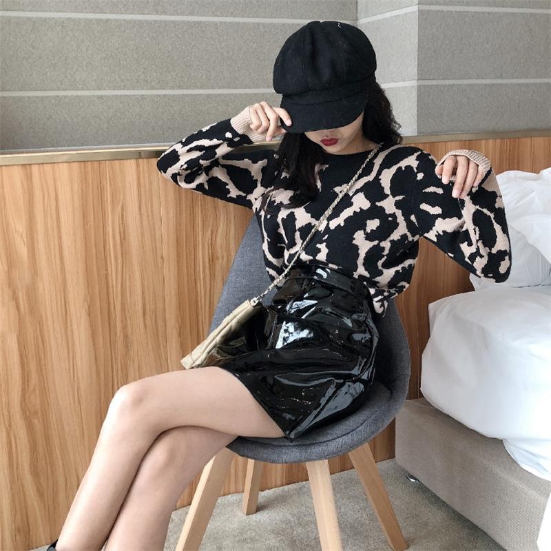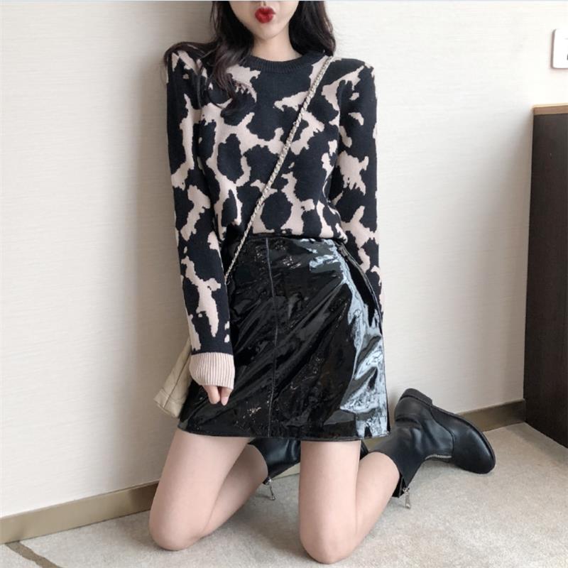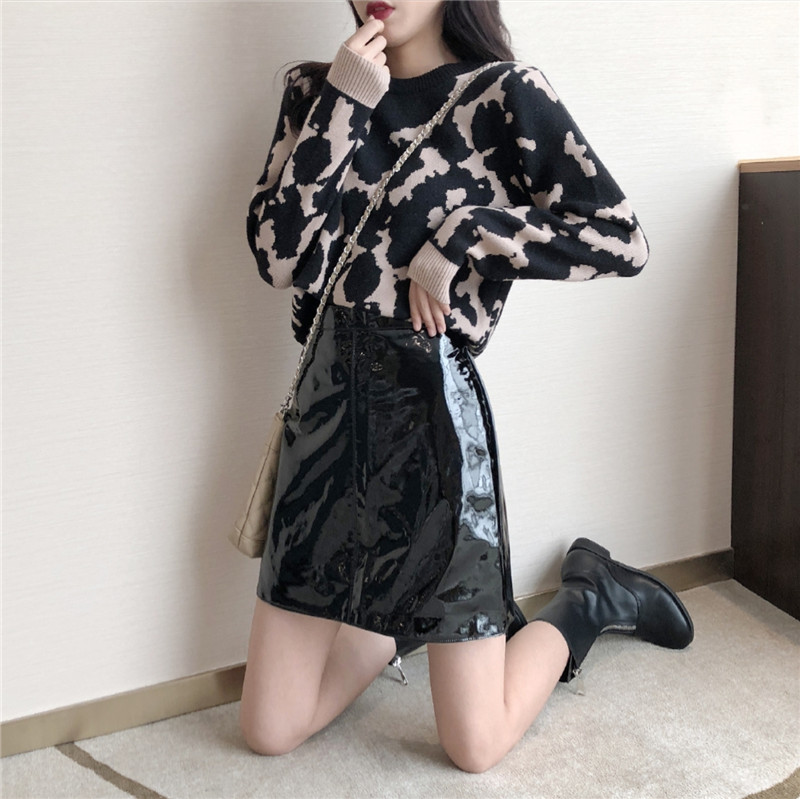 / 2018秋冬韓版新款豹紋套頭毛衣時尚套裝高腰漆皮半身裙chic兩件套