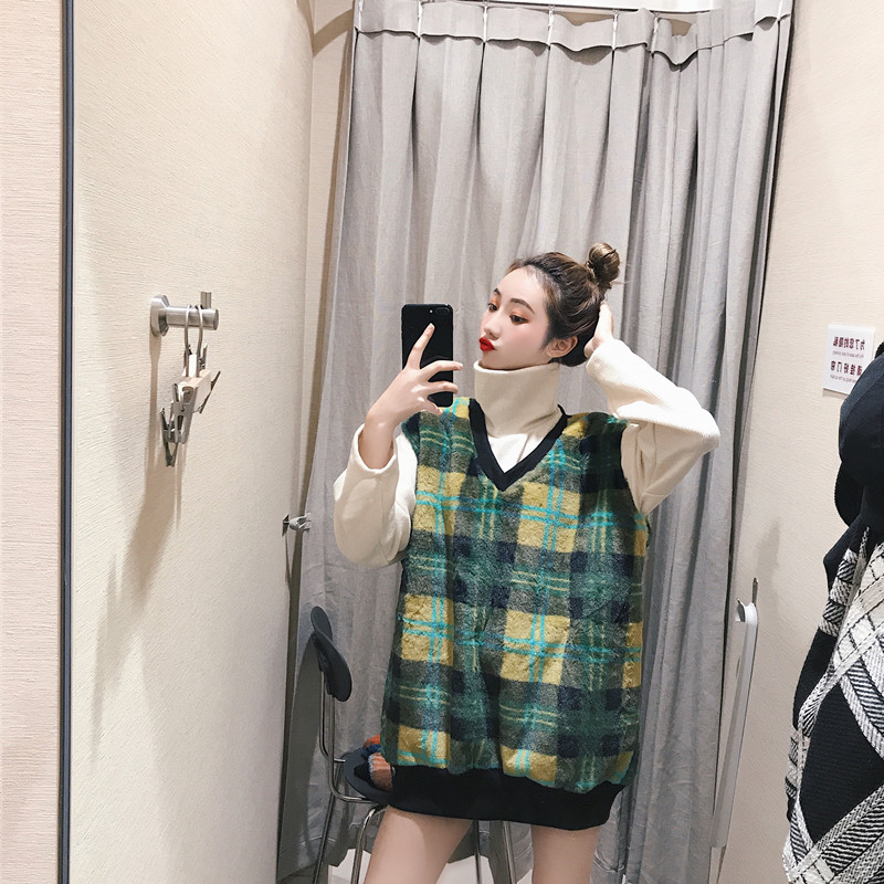/ 港風時尚套裝新款復古格子毛絨厚背心馬甲高領中長款打底衫兩件套