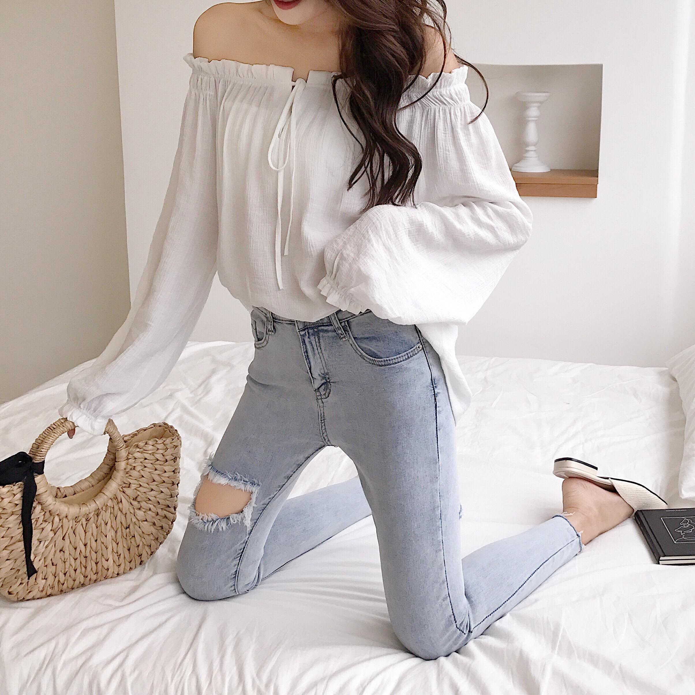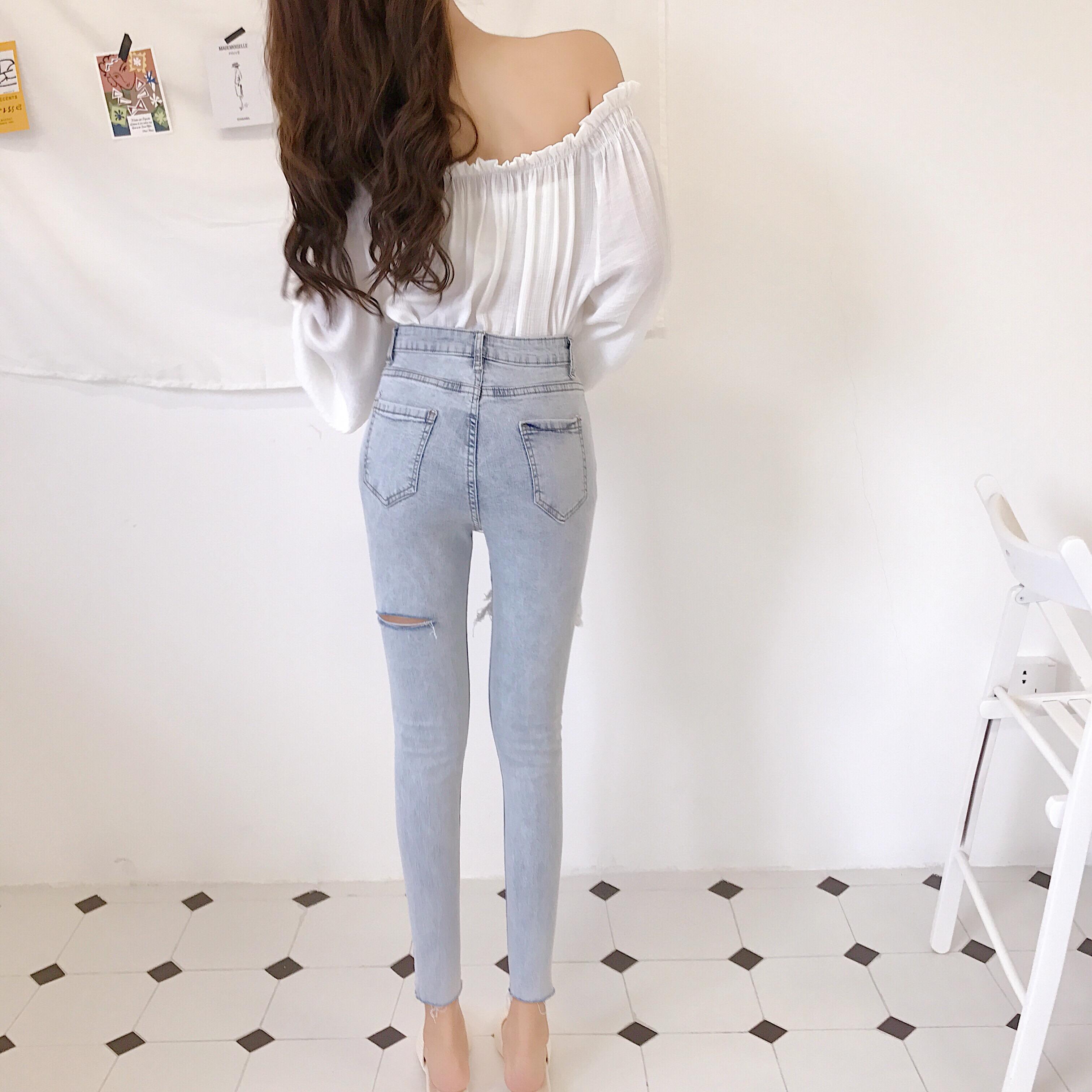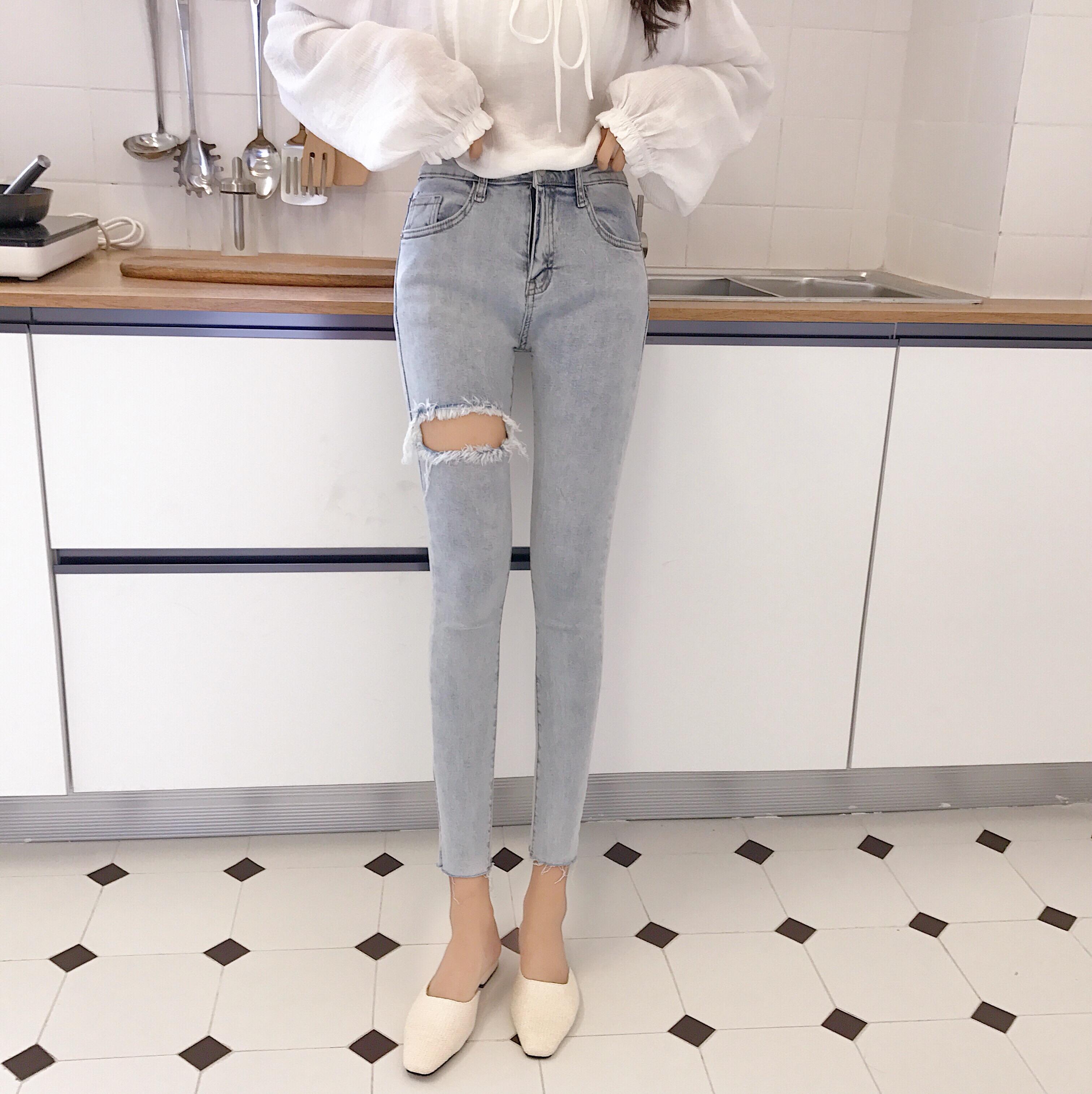 / 2018新款韓版復古風彈力緊身破洞顯瘦小腳鉛筆褲高腰九分牛仔褲女