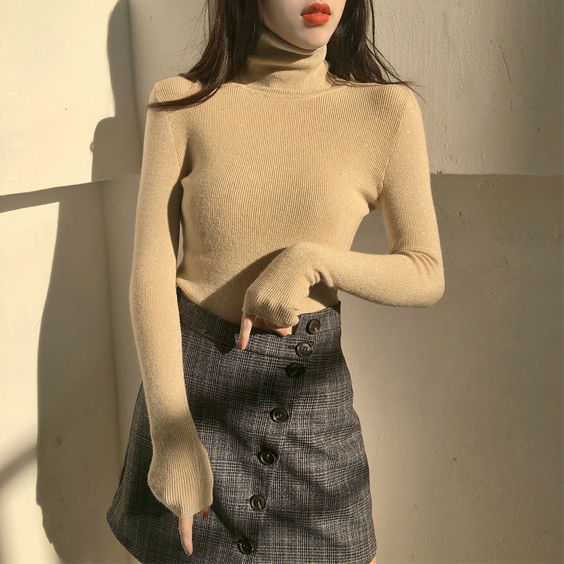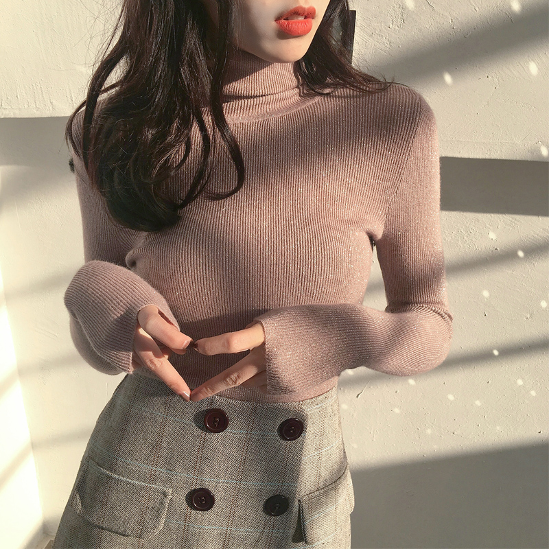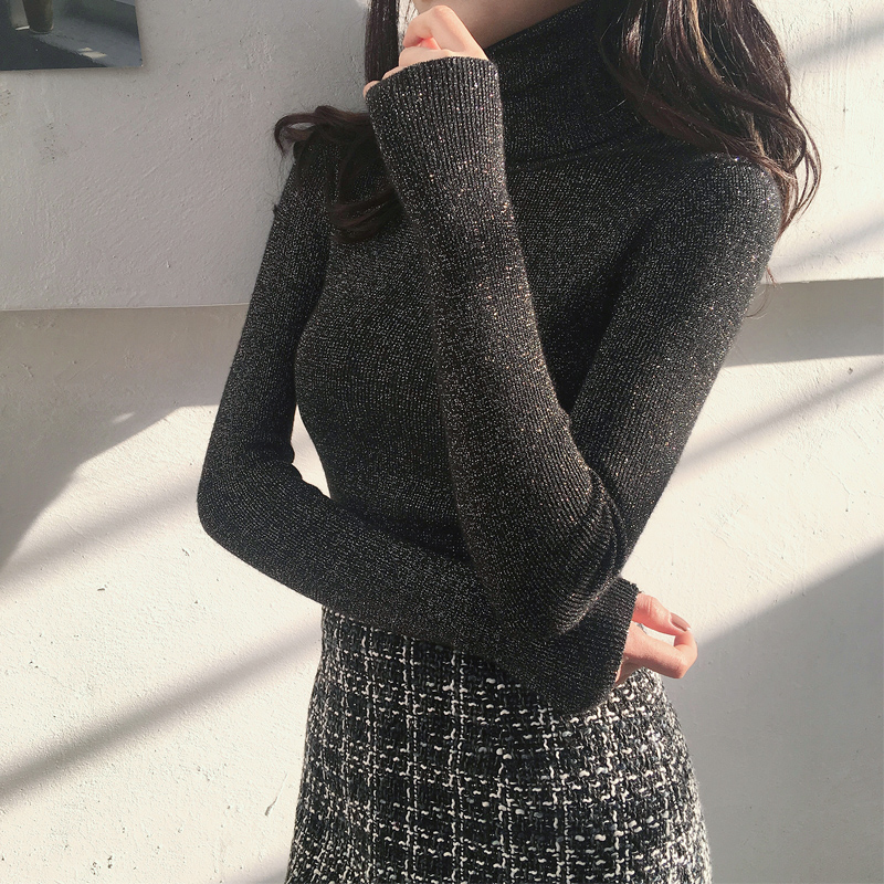 秋季新款chic韓版修身顯瘦高領亮絲針織衫港風女長袖毛衣打底上衣