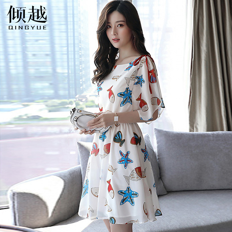 / 2017夏季新款收腰顯瘦印花雪紡連衣裙女夏中長款海邊度假沙灘裙子