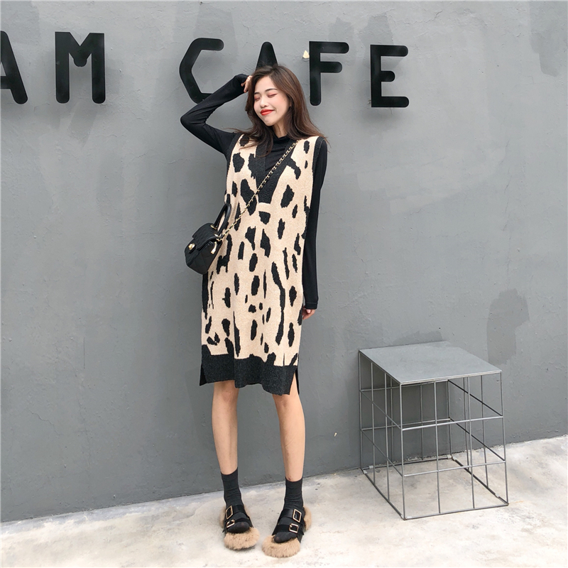/ 秋冬時尚女裝新款韓版chic慵懶風寬松百搭豹紋V領中長款針織馬甲